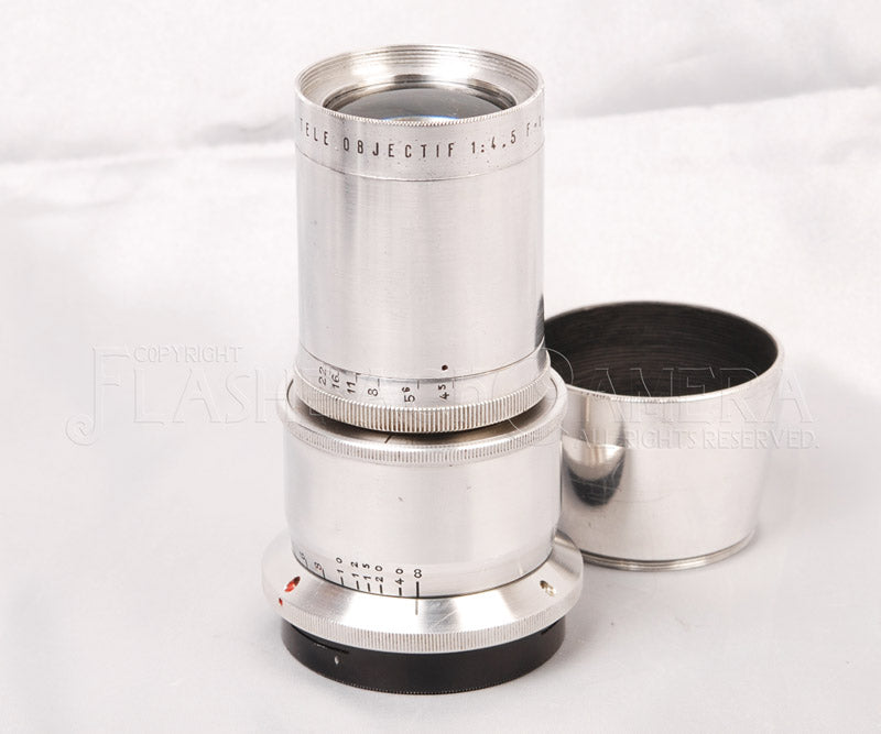1948年登場。仏SOM ベルチオ社製のレクタフレックス用望遠レンズ。2群4枚構成。メートル表記。コード名はOTSA。通常はクロームメッキと黒塗りのコンビ鏡胴ですが、本品はオールアルミの更に珍しいタイプ。フード込みで310gと非常に軽量な望遠レンズです。過去に当店で取り扱ったライカ・スクリューマウントのフロール 75mm f2.8等にも近いデザインです。被写界深度指標が無いなど、プロトタイプ的な雰囲気も色濃く残した一本。ベルチオらしい淡いブルーコーティングが施されています。珍品。