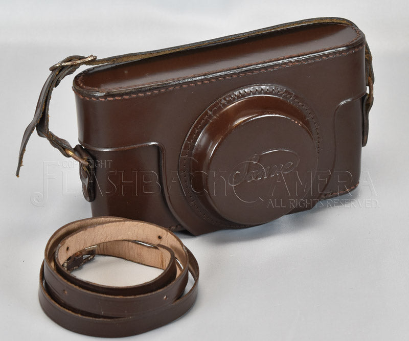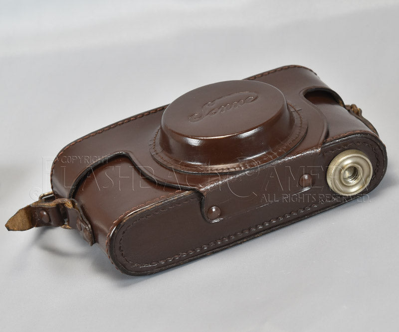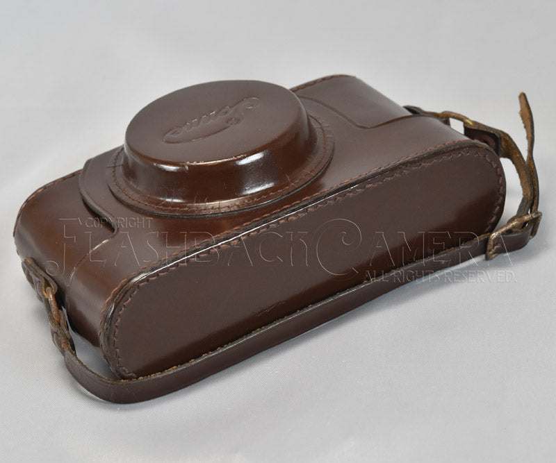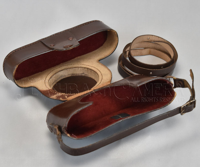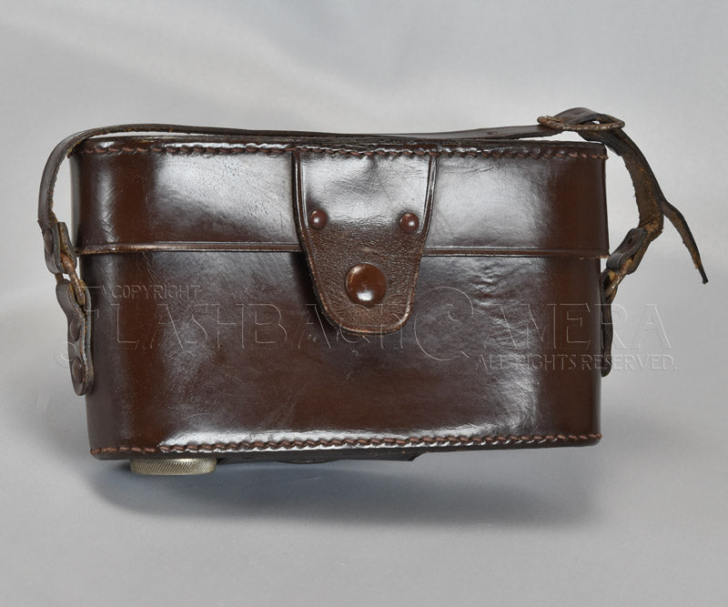 イタリアGatto社製のライカ・コピー、ゾンネ用革ケース。向かって右側に大ネジの三脚ネジがあります。実機が無く現物合わせは行っておりませんが、おそらくゾンネ C4等用のケースだと思われます。金具には錆びが見られます。革は少々固くなっていますが、上質のクリームを塗り込めばしなやかになるでしょう。それなりの使用感はありますが、さすがのイタリア製、製造から70年近くを経ても革はしっかりしています。