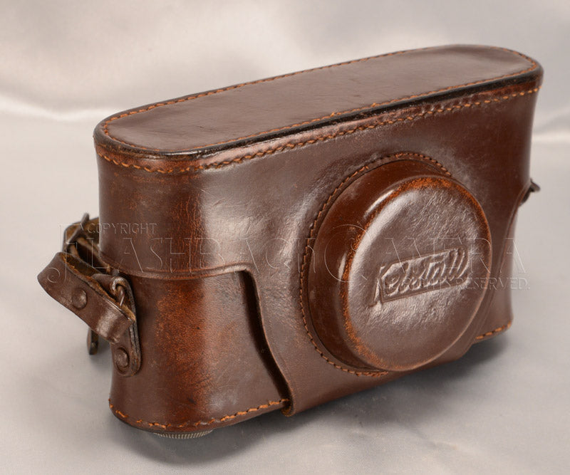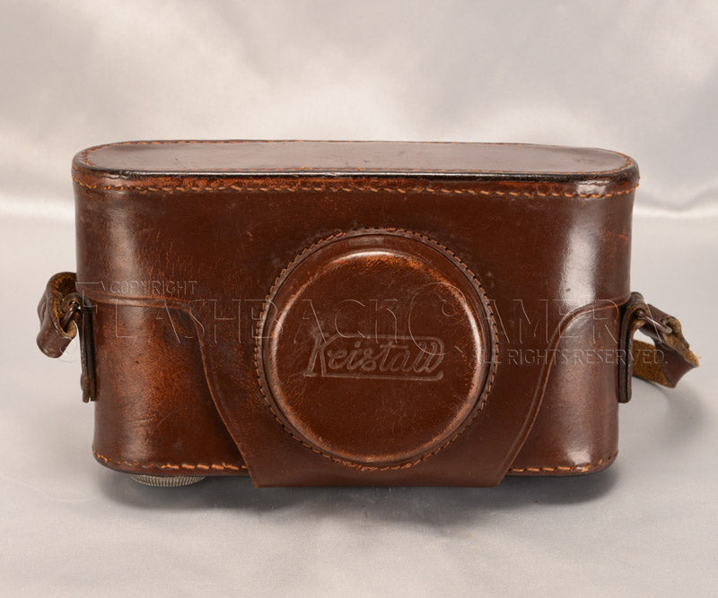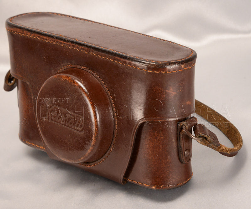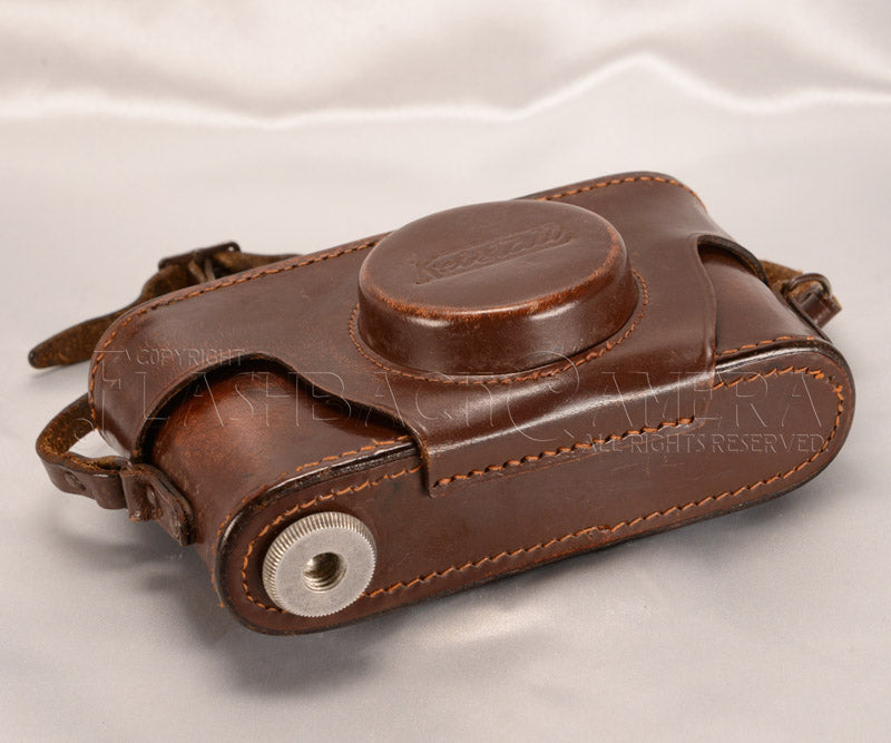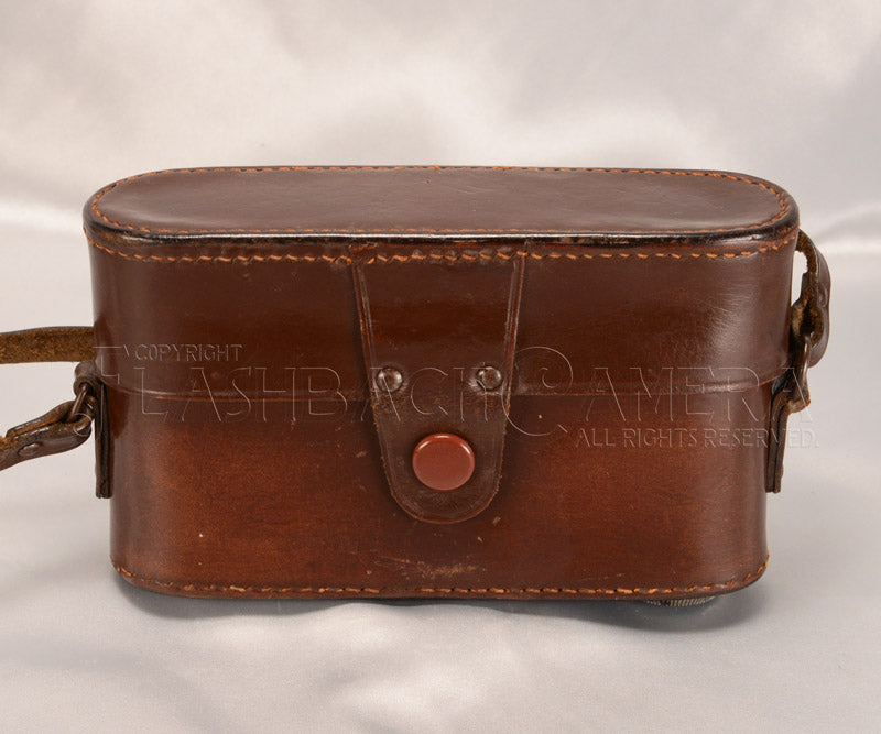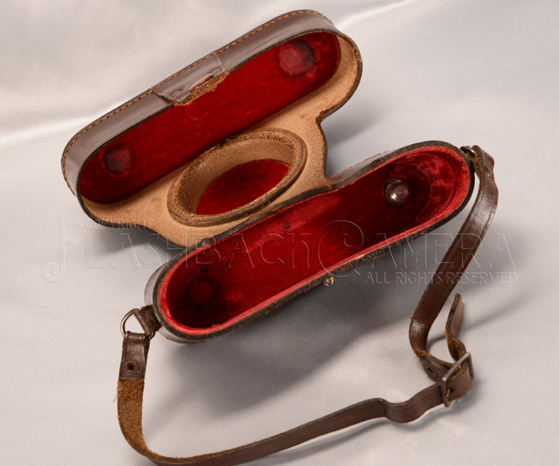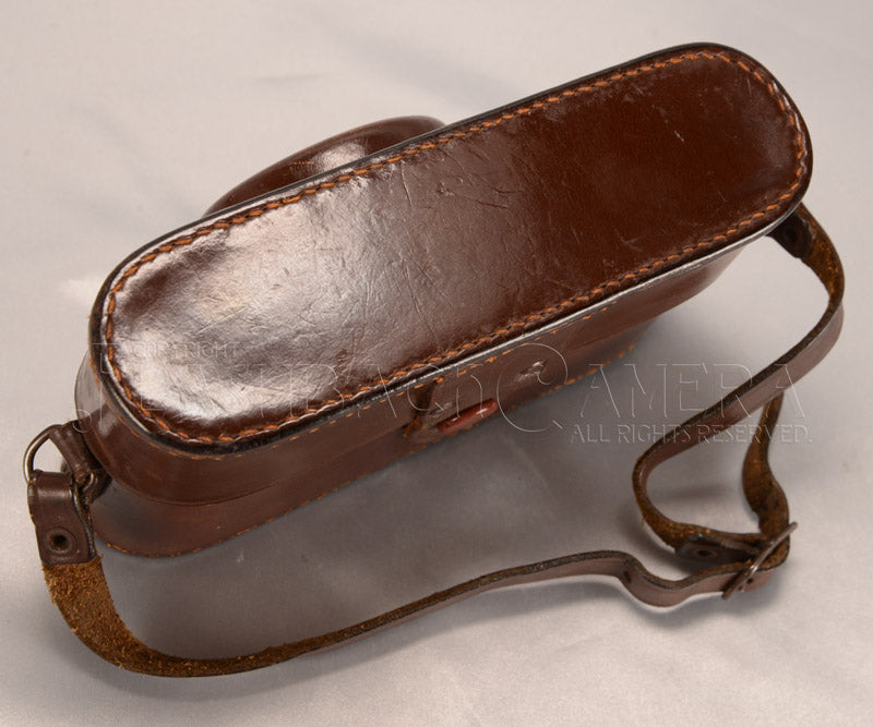 1950年代初頭に製造されていた、イタリアChinaglia社製のライカ・コピー、クリスタール用革ケース。向かって左側に大ネジの三脚ネジがあります。短いストラップですが、他の革ストラップなどを用いれば延長もできます(ご相談ください)。