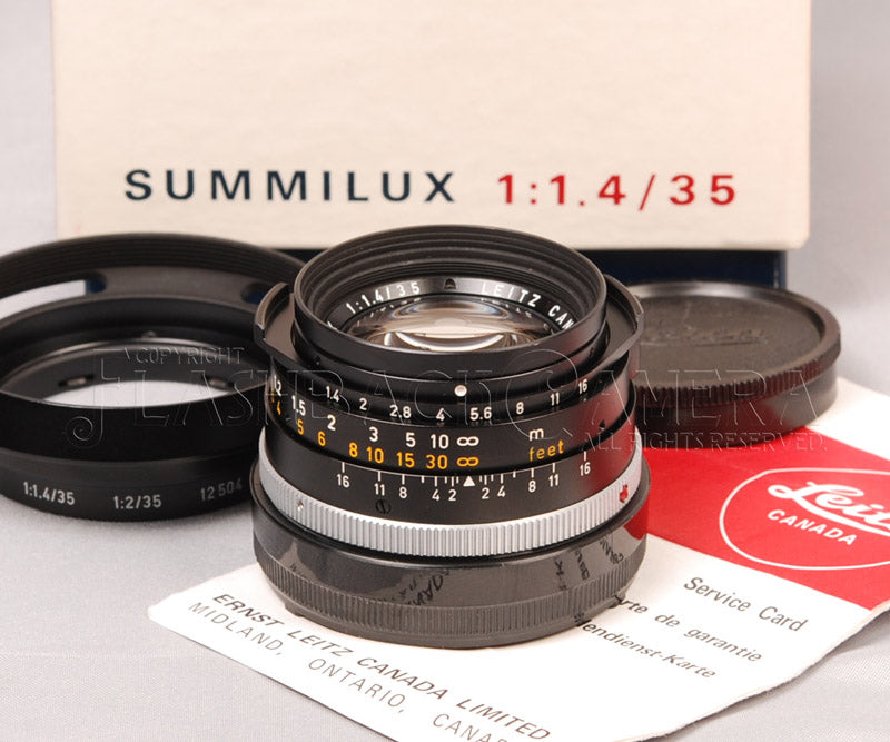 11870。262万台、1973年製、カナダ製のズミルックス 35mm非球面セカンド。ライツの定番大口径広角レンズ。使用感見られず、鏡胴もガラスも非常に綺麗、付属品も含めて申し分の無いコンディションです。保証書はさすがにヨレていますが、他は箱から取り出したばかりの新品同様品と呼んで差し支え無いでしょう。