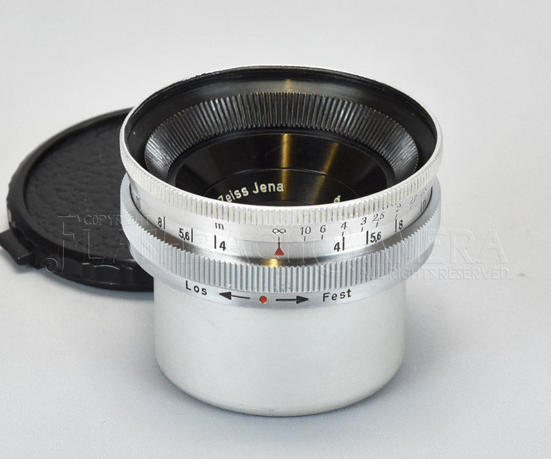 戦後Carl Zeiss Jena製、コンタックス用のトポゴン 25ミリ。ハイペルゴンのメニスカスレンズ設計を基礎とした対称構造の4群4枚構成。距離計には非連動ですが、深〜い被写界深度で目測撮影が楽しい一本。距離リングの表記はメートル。ゲルツ社で活躍したRichter博士により生み出された超広角レンズは、本来は航空写真が開発目的だった模様です。非常にRがキツく小さなガラスですので、製造はさぞかし困難を極めたようです。大切に取り扱いたいレンズですね。製造本数は1000本程度で本品は後期ロットとなります。