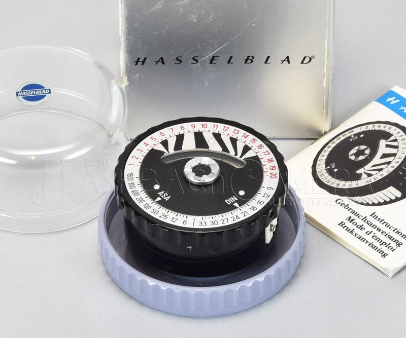 54011/TIMCC。 ハッセルブラッド純正ノブ・メーター。500C、500 C/M等のモデルの巻き上げノブと交換して装着する、露出計付き巻き上げノブです。ゴッセン製セレン式メーター。取り付け部に少々擦れが見られますが、他は使用感無くとても綺麗。測光値もほぼ正確です。ライトバリュー式。小さなケースに収まった佇まいが何ともお茶目、物欲を刺激されるアクセサリーでもありますね。取説、元箱まで揃っています。
