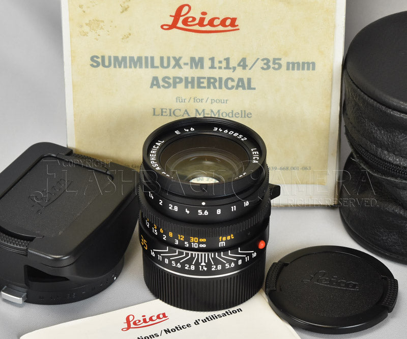 11873。346万台。ノクティルックス 50mm f1.2に続き、非球面レンズが採用された初代ズミルックス 35mm f1.4 アスフェリカル。通称AA(ダブルエー)。5群9枚構成。2群目と5群目に非球面レンズを採用。製造が困難で生産が追いつかず、わずか数年で生産終了してしまいました。1990年にフォトキナで発表されましたが、製造番号から調べると本品は1988年製です。発表後の販売に備えた生産で苦労したのかも知れません。そんな想像に説得力を与えてしまうほど見事な描写力を秘めています。稀少。