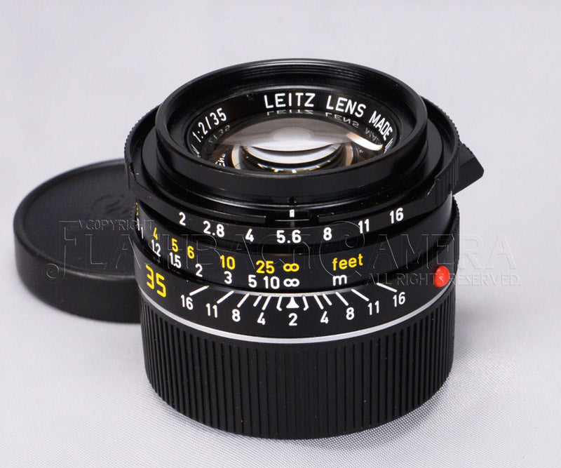 11310。297万台。1979年、カナダ製。飛び出したヘリコイドの操作ノブが特徴的なズミクロン 35ミリ、7枚玉の初期型です。5群7枚構成。ズミクロン 35ミリの第3世代。ライカMの広角レンズとして正常進化しています。外観はだいぶ簡素化されましたが、描写はさすがのライツ。濃厚なボケ味と豊かな階調が得られる素晴らしい描写力と、軽量でミニマルな機能的デザインが持ち味です。近年、7枚玉の魅力が再認識されており人気の高まりを感じます。とりわけ近接での撮影にて、濃厚なボケ味がお楽しみ頂けます。前後純正キャプ付。