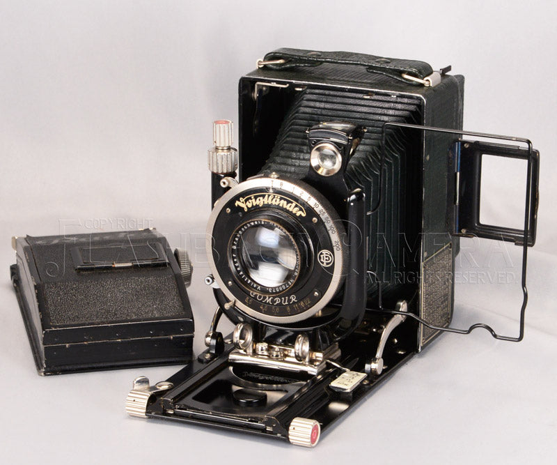 フォクトレンダー社の乾板用ハンドカメラ。ベルクハイルの後期型。1932〜36年製。レンズ交換可能。ヘリアー105mm付。本品は緑の革張りのデラックス・モデル。6.5x9cm判(大名刺判)。Rada製の6x9用ロールフィルムホルダーが付属していますので、120フィルムを使って撮影を楽しめます。レンズの状態も大変良く、銘玉ヘリアーの描写をご堪能頂けます。こんなご時世だからこそ、ゆったりとした撮影の作法も含めてじっくりお楽しみ頂きたい、戦前フォクトレンダーの銘機です。