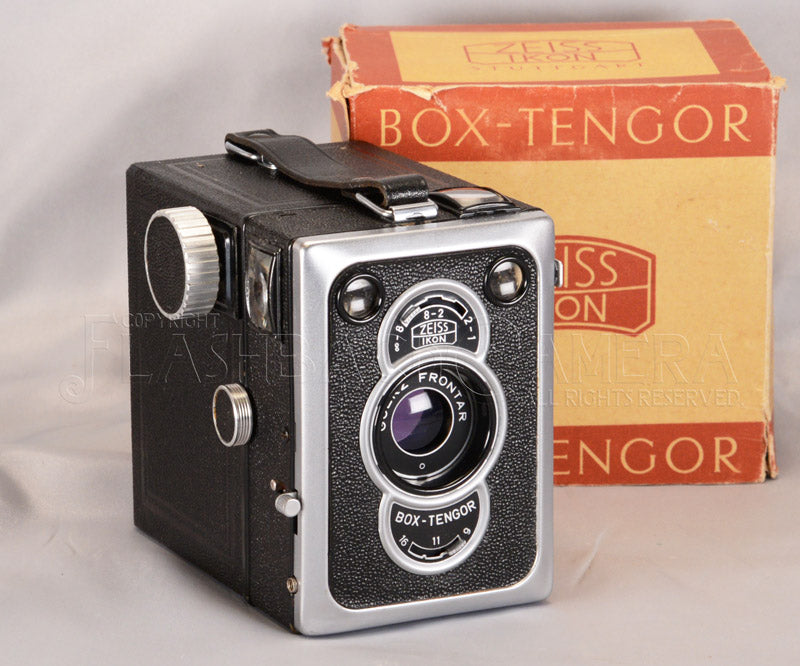 56/2。戦前から製造されているツァイスの定番ボックスカメラ、ボックス・テンゴールの戦後モデル。1948〜56年の製造です。前枠がクロームメッキで飾られ、よりモダンなデザインとなりました。二重露出防止機構付。大ツァイスの製品とは言えボックスカメラですので、描写はそれなりでしょうが、たまにはこんなカメラを構えて、のんびりと近場の休日を楽しむのも良いかも知れませんね。とても綺麗な一台。