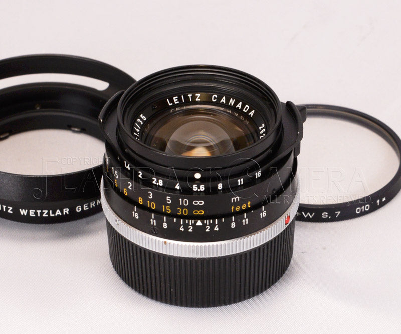 11870。262万台。1973年、カナダ製のズミルックス 35mm f1.4。第2世代。ライツを代表する大口径広角レンズで、30年以上生産されたロングセラー・モデルです。開放付近でのふわりとやわらかな描写から、絞り込めば穏やかな空気感を残しつつシャープな描写、美しい線を描き出します。純正12504フード、B+W製のシリーズ7フィルターが付属します。外観、ガラス共に綺麗な一本です。
