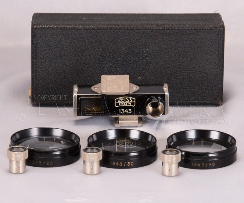 1343。コンタックス I、II型用接写アタッチメント、コンタメーターの初期モデルです。黒&ニッケル。ゾナー 50mm等に装着し、20cm、30cm、50cmの接写が可能となります。1930年代前半のツァイスのゴージャス感がそのまま残っています。丁寧なつくりの革張りケースにもツァイスらしい気品を感じます。実用性はともかく、コレクション棚に飾っておきたいアクセサリー。現状渡し品です。