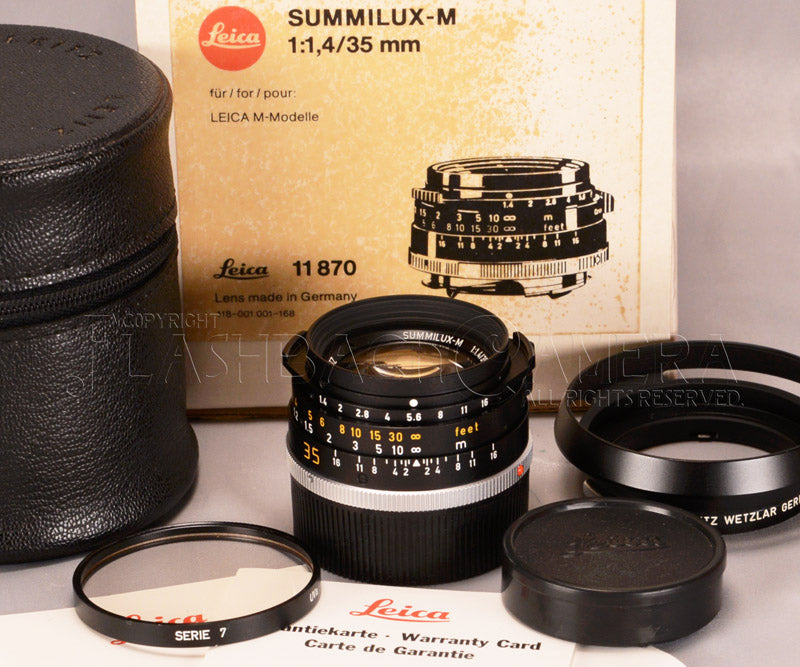11870。347万台。1988年、ドイツ製。ズミルックス-M 35ミリ f1.4。球面ズミルックス 35mm 2ndは、1961年から1995年までモデルチェンジされずに製造され続けた長寿命レンズ。現在も非常に根強い人気を誇ります。開放と絞った時の描写の大きな変化がその醍醐味でしょう。表現力に幅があり懐が深いレンズです。小型軽量でf1.4の明るさ、個性ある描写力、優れたデザイン性、と類いまれなる完成度を誇ります。本品は抜群のコンディション、付属品も全て揃っておりコレクションにも向いた1本です。