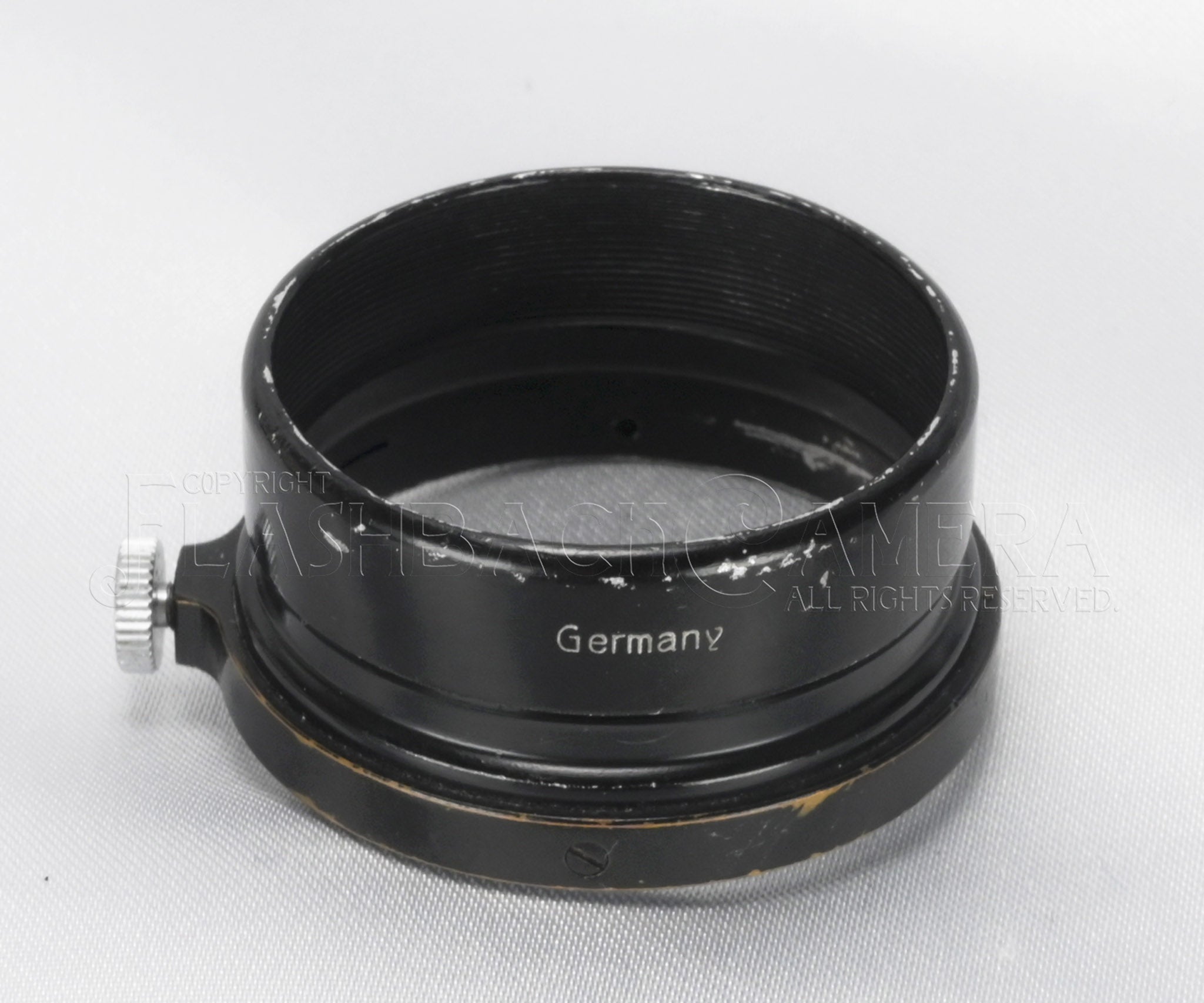 ブラックペイント仕上げ。レンズに装着する部分の板バネとフード部がアルミ製で、外周の基部パーツは真鍮製。珍しいタイプです。重量は実測で約9.6gと非常に軽量。留めネジは真鍮にクロームメッキ。