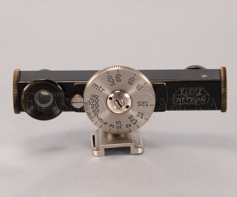 HFOOK。シュー付距離計。ライツの単独距離計FOKOSに可動型シューFOKABが付いたモデルです。黒/ニッケル。ニッケル足。距離ダイアルはmeter表記。基線長75mm。最短測距離は0.75メートル。距離の刻みは細かいタイプ。