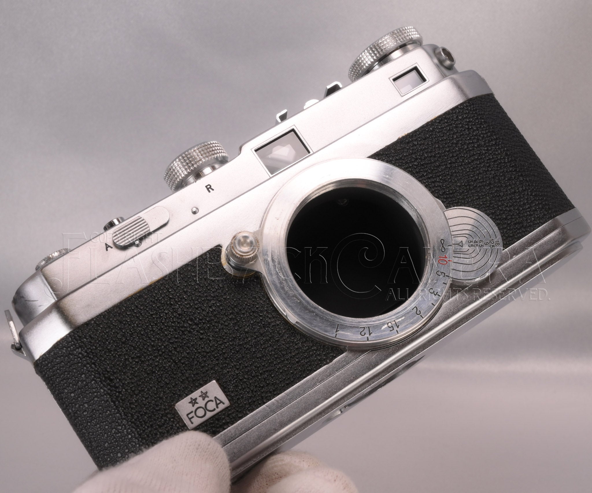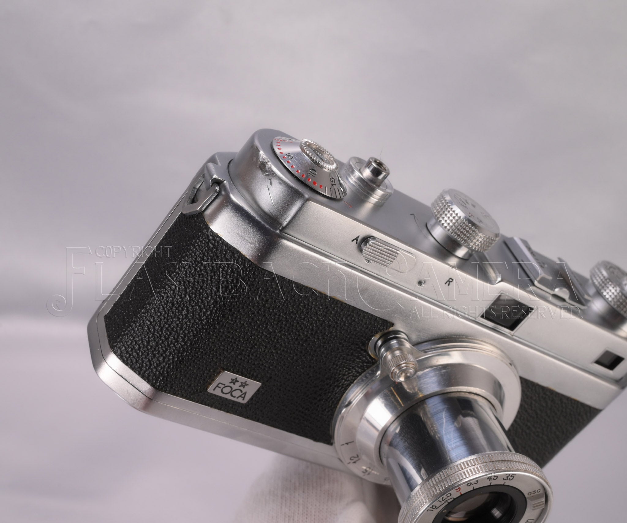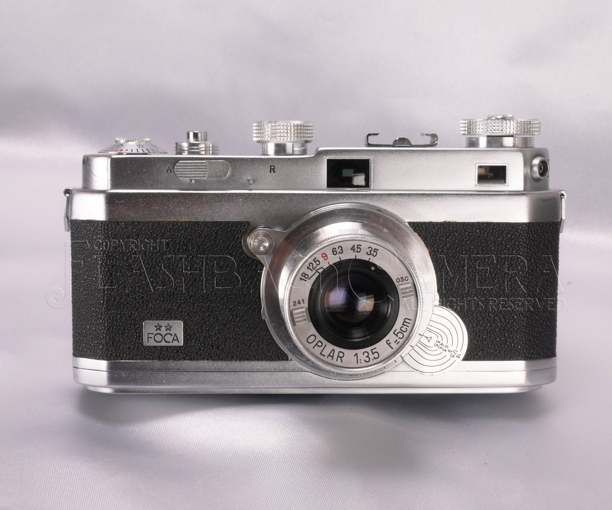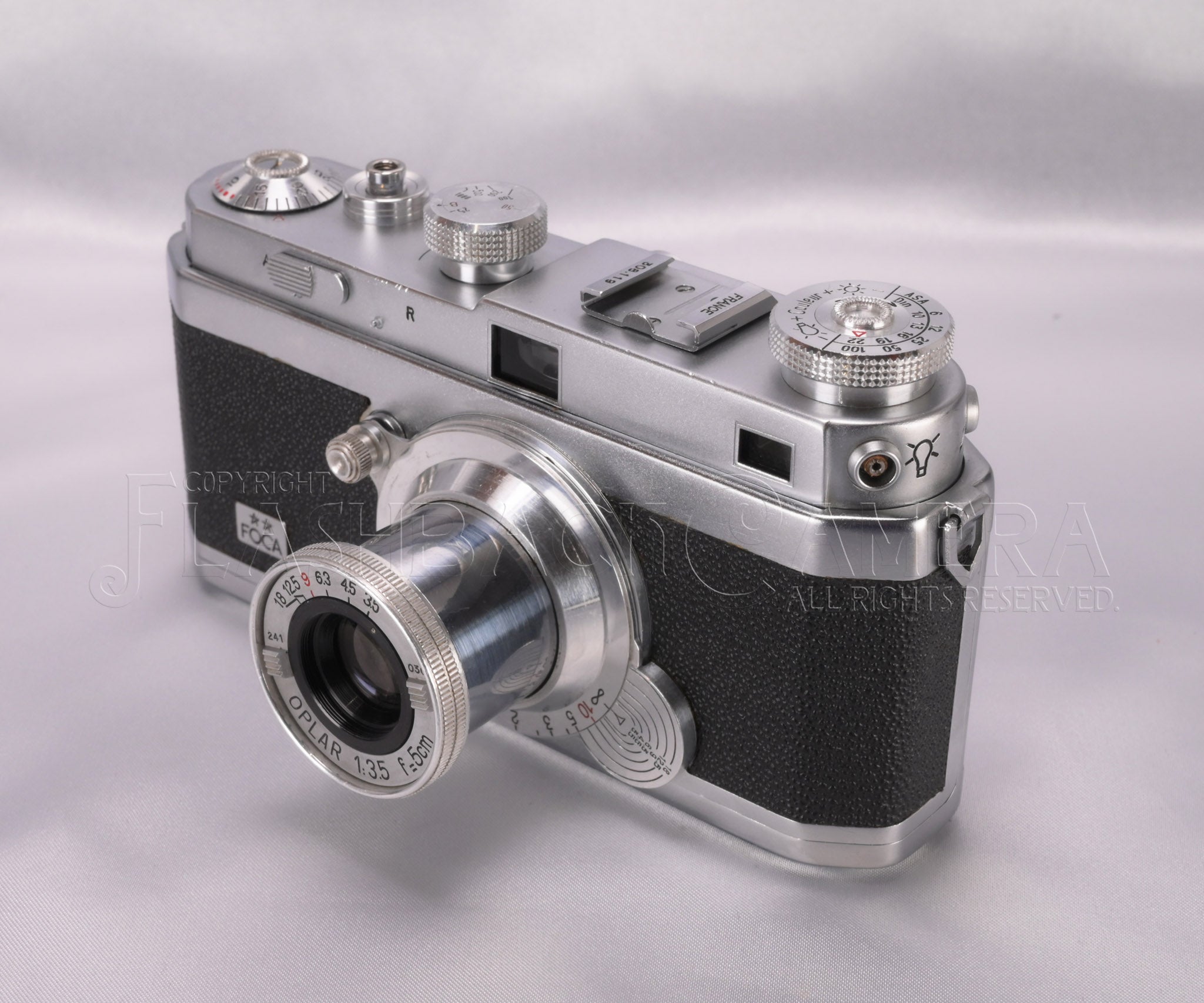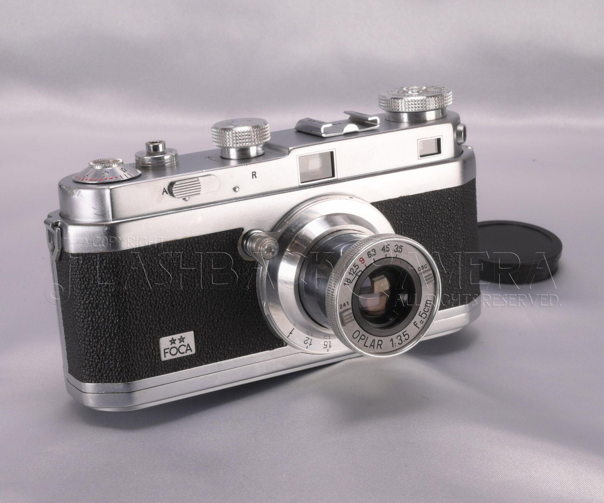 仏OPL(ルバロワ精密光学)社製のライカ型カメラ。すっきりとした端正なデザインが麗しいフォカ2スター(PF2)。1945年の登場です。一眼式連動距離計付きレンズ交換式カメラ。距離計対物レンズが左寄りに装備されており、うっかり右手でファインダー窓を遮ることがありません。