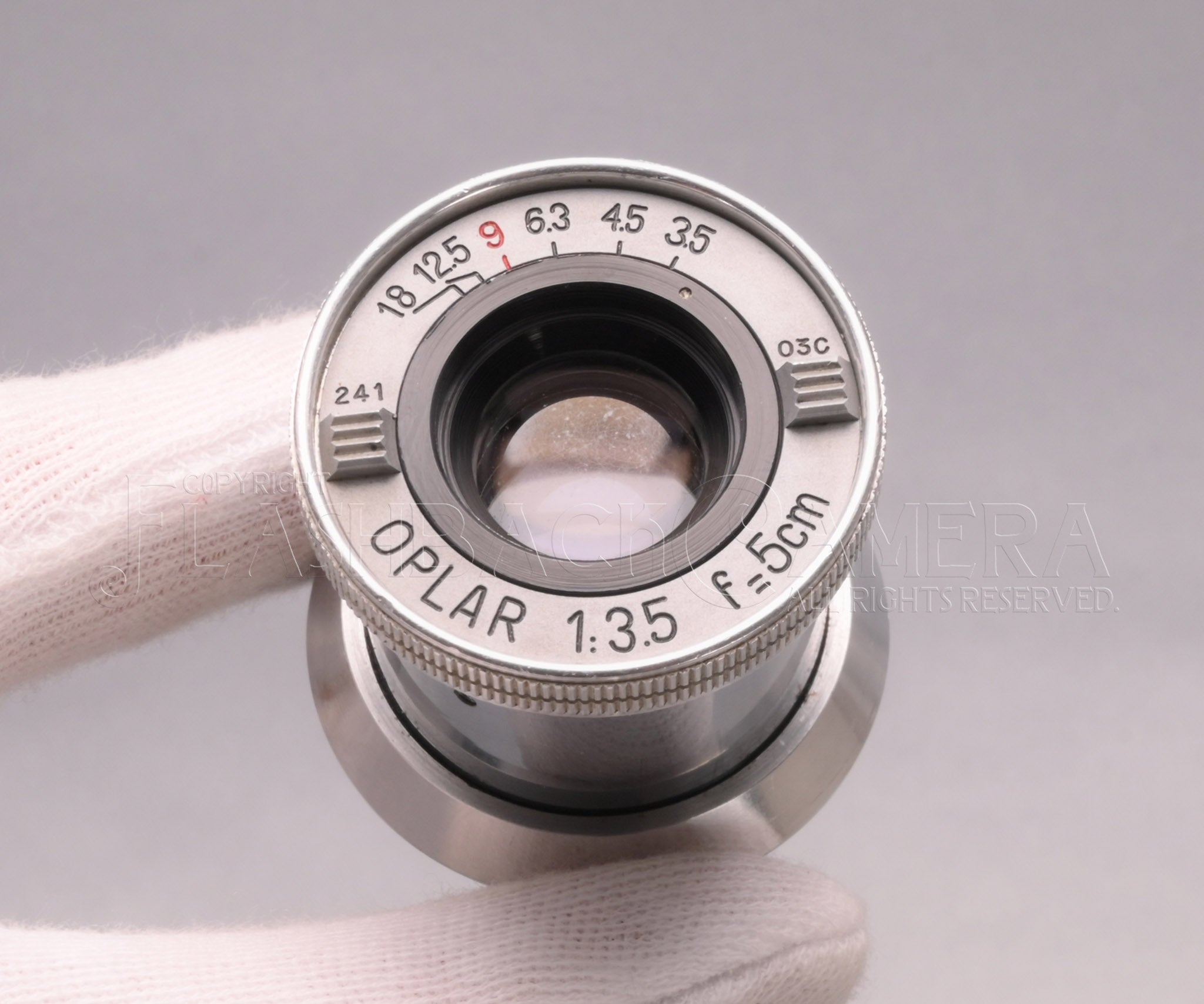 付属のレンズは標準のオプラー 5cm f3.5。沈胴基部がスクリューマウントとなっており、広角・標準・望遠のレンズ交換が可能でした。