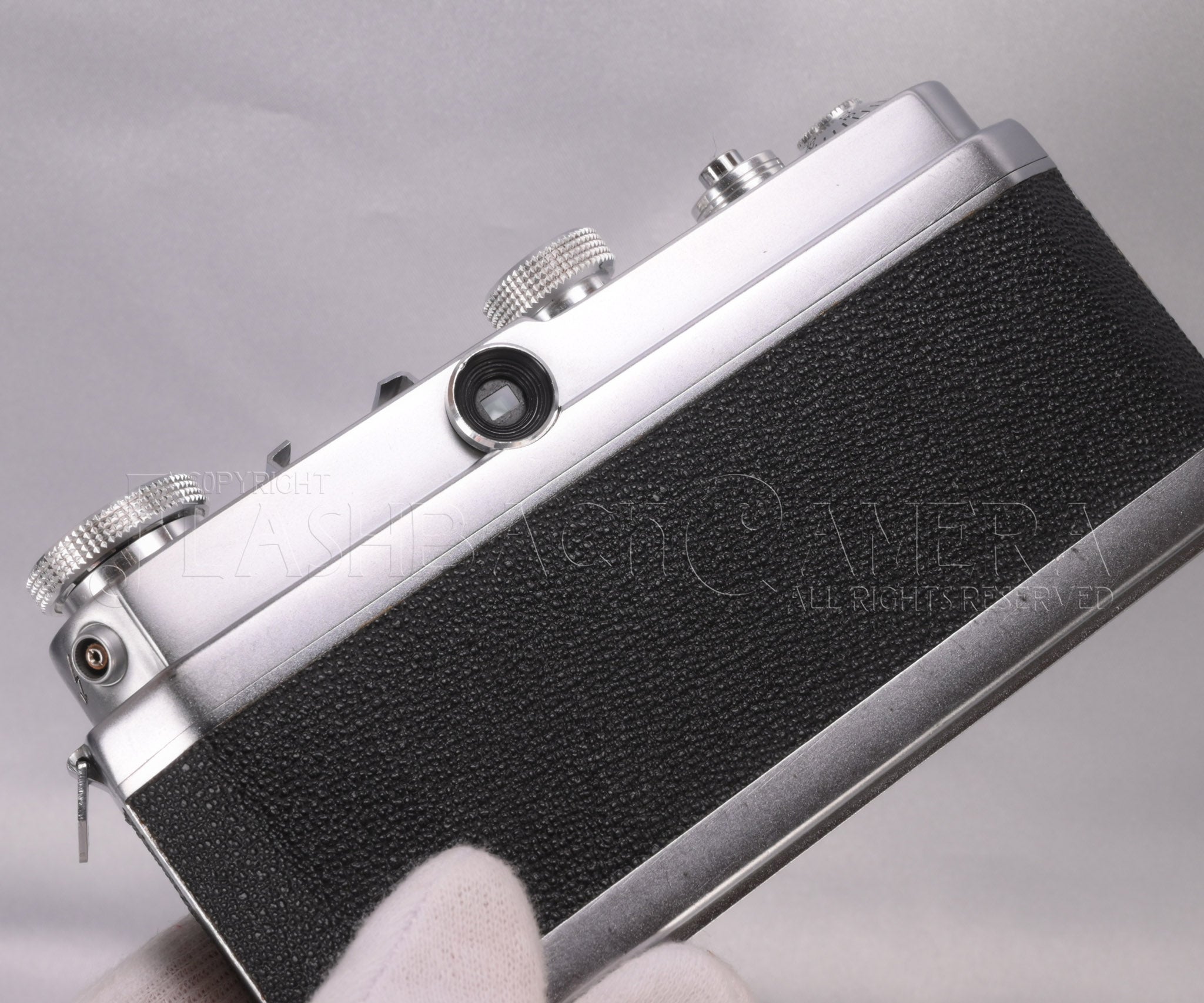 2024年4月にボディとレンズを専門業者にて整備しました。各部の動作良好です。オプラーレンズの前玉には、浅い拭き傷がやや多く、またコーティングの傷みが見られます。硝材の柔らかいフォカ用レンズとしては通常のガラスコンディションです。