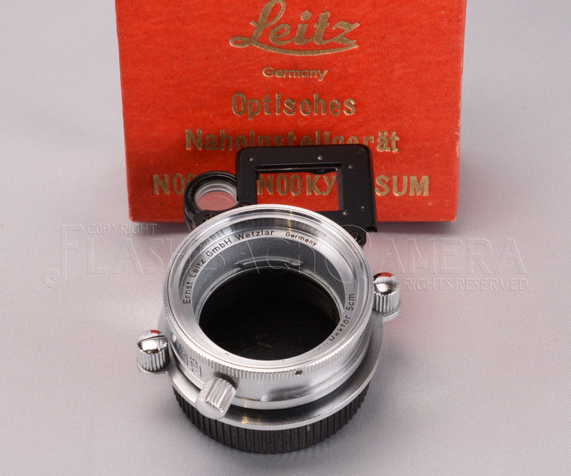 44cmまでの接写が可能で、かつパララクスも補正される見事な機構です。L/Mアダプターは装着できないので、残念ながらライカM型には装着不可。ライカ IIIaまでのモデルでは距離計窓の大きさが異なるため、本品を装着することが出来ませんのでご注意を。元箱付です。