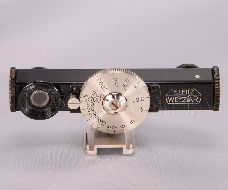HFOOK。シュー付距離計。ライツの単独距離計FOKOSに可動型シューFOKABが付いたモデル。黒/ニッケル。ニッケル足。距離ダイアルはfeet表記。基線長75mm。最短測距離は2.6フィート=0.8メートルです。