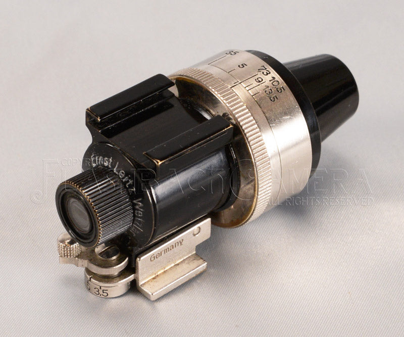パララックス補正機構付のライツの逆像ビドムファイダー。黒/ニッケルの仕上げが美しい。シュー部分は短いタイプ。35/50/73/90/105/135mmレンズに対応します。パパラクス補正はフィート表記。
