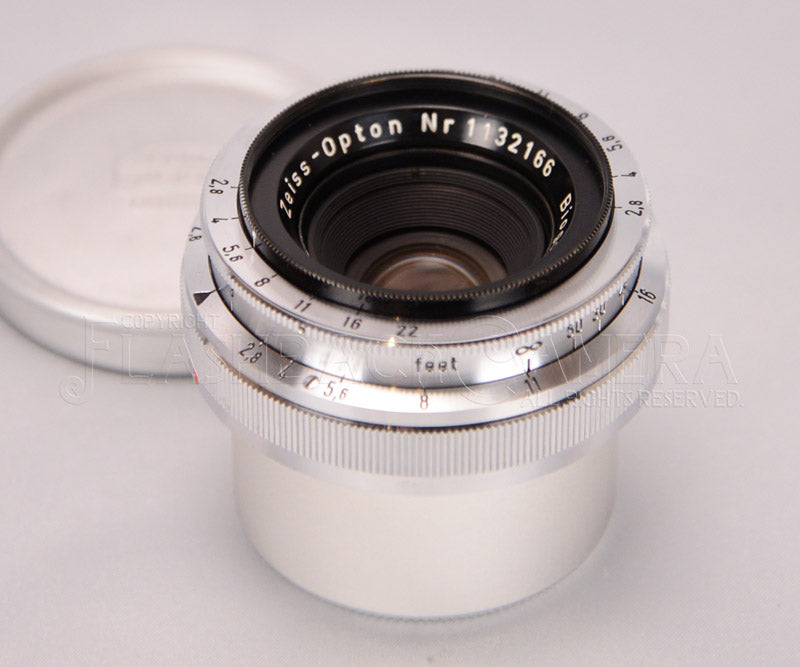 戦後Zeiss Opton製。ビオゴン 35mm f2.8。コンタックス IIa / IIIaの時代の製品です。真鍮に美しいクロームメッキ鏡胴。距離表記はfeet。淡い紫のTコーティング。