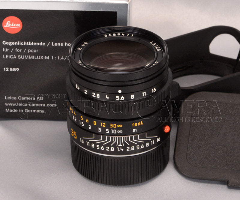 ズミルックス-M 35mm f1.4 アスフェリカル。ライカのコードは11874。製造番号365万台、1994年製。6bitコード付。本品は非球面レンズを2面採用した、初代ASPHERICAL(通称AA)の後継モデル。フィルター径はE46。専用の12589フードははめ込み式。