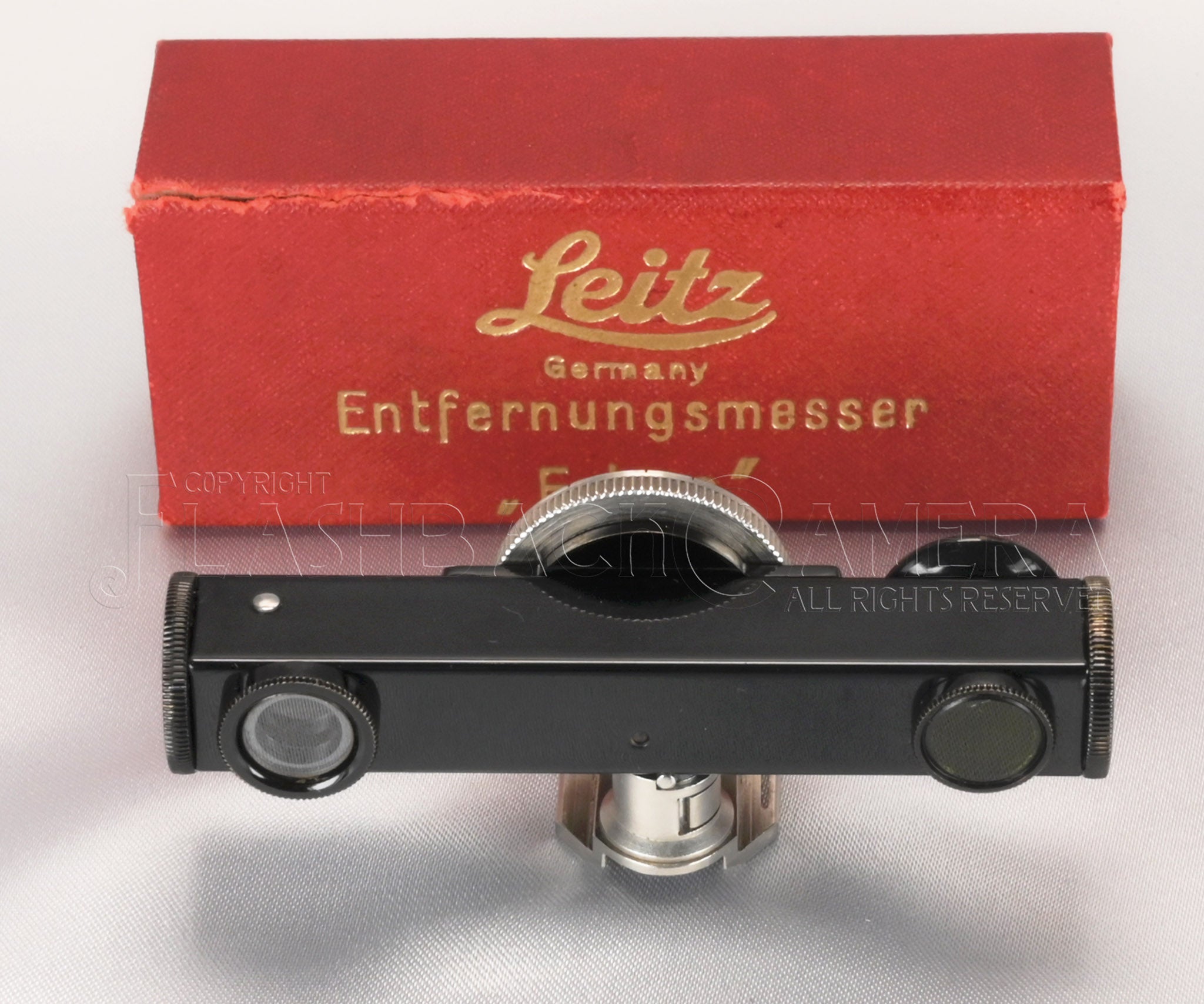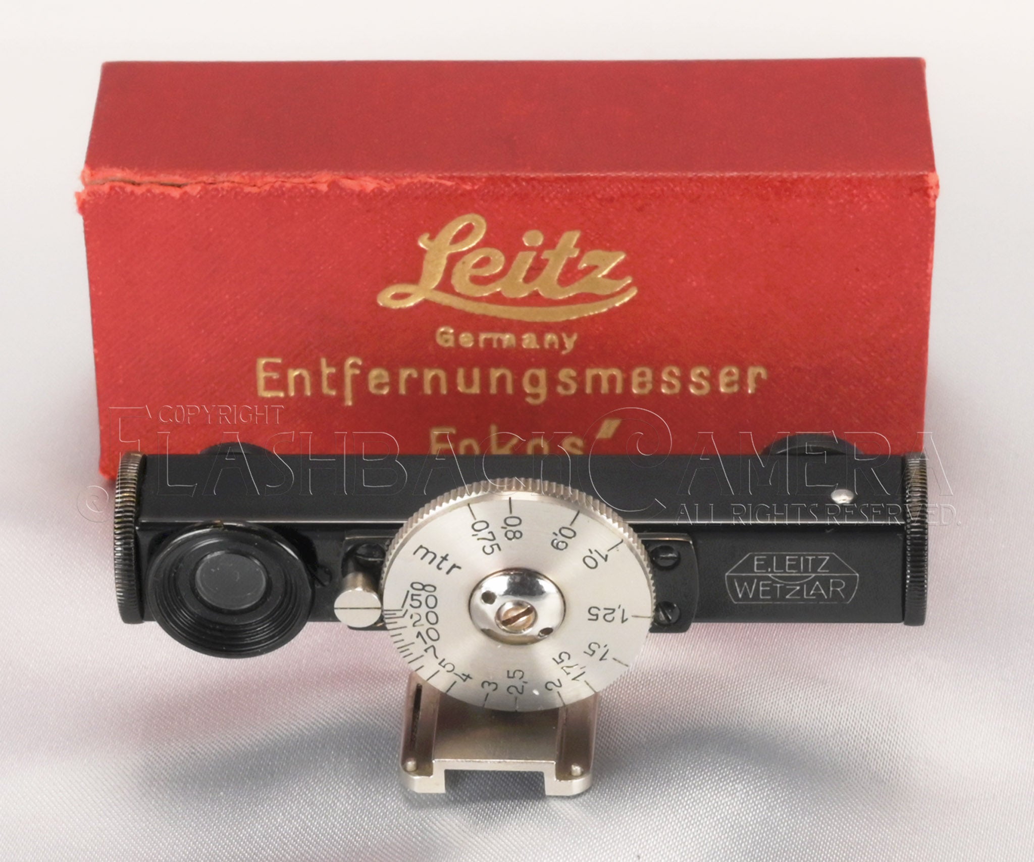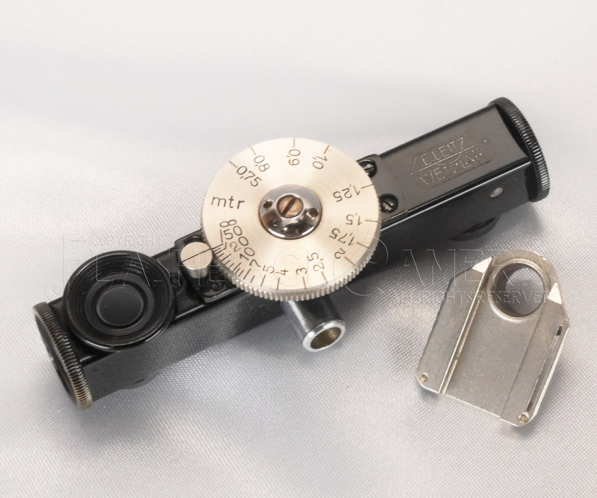 HFOOK。シュー付距離計。ライツの単独距離計FOKOSに可動型シューFOKABが付いたモデル。黒/ニッケル。ニッケル足。距離ダイアルは嬉しいメートル表記。基線長75mm。最短測距離は0.75メートル。
