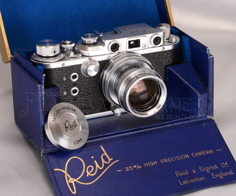 英Reid&Sigrist社製、リード III型。ライカ IIIbをお手本として製造されたライカコピー機です。本品はシンクロが付いたリード IIIa、もしくはType IIと呼ばれるモデル。1953〜1964年の間に約1200台が製造されました。ボールベアリング内蔵のシャッター機構、スローダイヤルのネジが無いことなど微妙な差異はありますが、実に良く出来たライカ型カメラ。