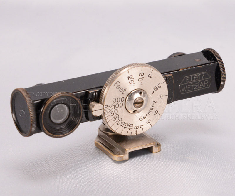 HFOOK。シュー付距離計。ライツの単独距離計FOKOSに可動型シューFOKABが付いたモデル。黒/ニッケル。ニッケル足。距離ダイアルはfeet表記。基線長75mm。最短測距離は2.6フィート=0.8メートルです。