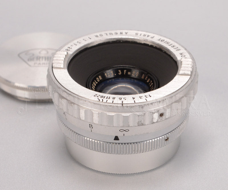 仏Som Berthiot社製。広角レンズ、アンギュロール 28mm f3.3。ライカ・スクリューマウント。4群4枚構成。ベルチオレンズらしい、透明感のあるブルーコーティング。メートル表示。距離計連動。最短撮影距離は0.75m。