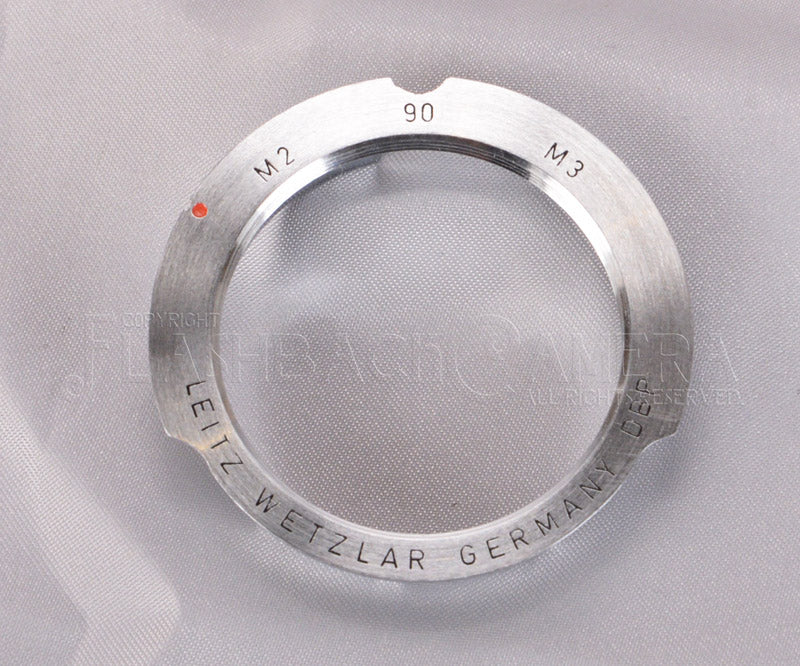 ISBOO/14098。ライカの90mm、28mm用アダプター。本品は大文字の刻印、ライツ銘、切り欠けのあるタイプです。M型ライカに装着すると、90mmと28mmのファインダー枠が表示されます。
