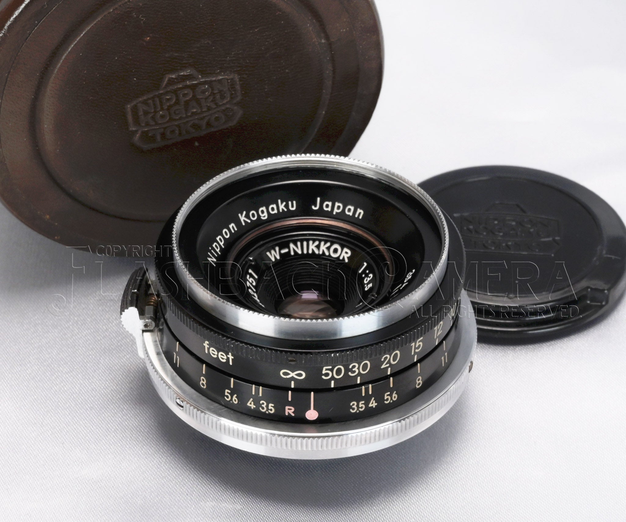 日本光学製広角レンズ。1948年登場のニコンSシリーズ用のW-ニッコール 3.5cm f3.5。本品はアルミに黒塗装仕上げの後期型。レンズ構成は3群4枚構成のテッサー型。feet表記。実測で99gと軽量な作りです。フィルター径は43mm。