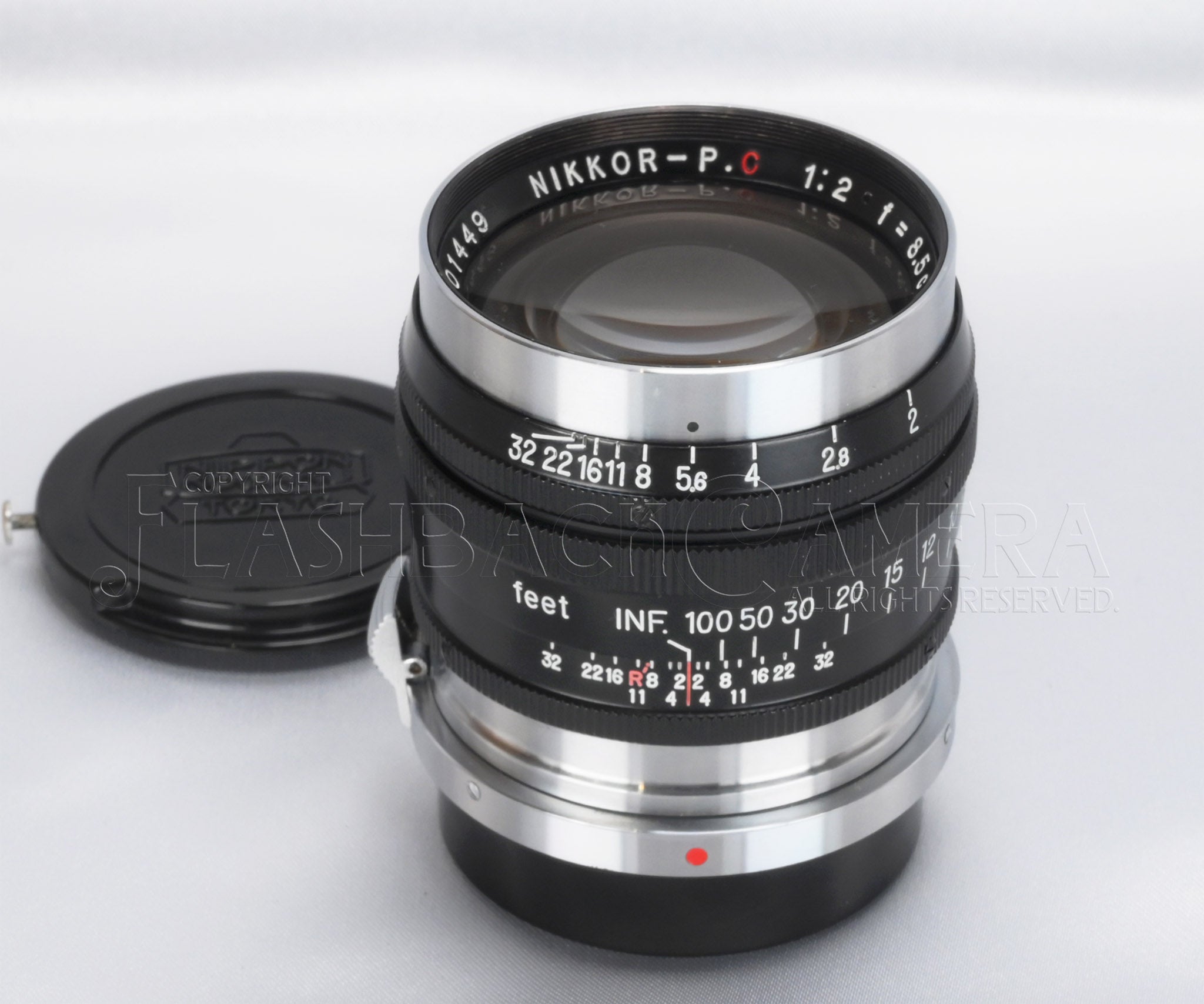 銘玉・ニッコール-P.C 8.5cm f2の最終型。黒鏡胴。ニコンSマウント。外爪。ニッコール 85mmは1948年に登場し、初期はクロームメッキの白鏡胴でした。3群5枚構成のゾナー型。フィルター径は48mm。距離表記はfeet。