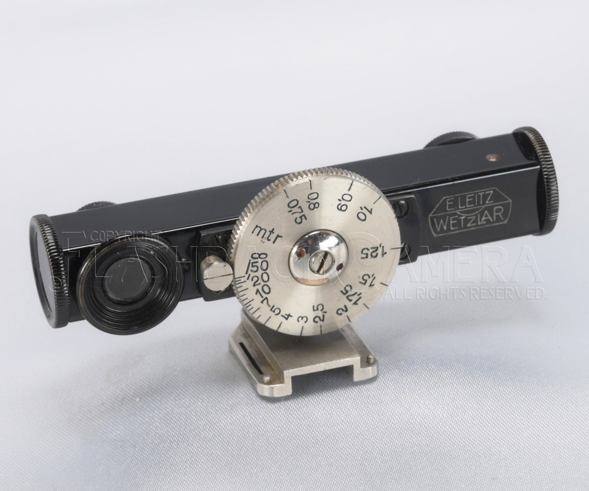 HFOOK。シュー付距離計。ライツの単独距離計FOKOSに可動型シューFOKABが付いたモデル。黒/ニッケル。距離ダイアルはmeter表記。基線長75mm。最短測距離は0.75メートル。アクセサリーシューに装着して使用します。