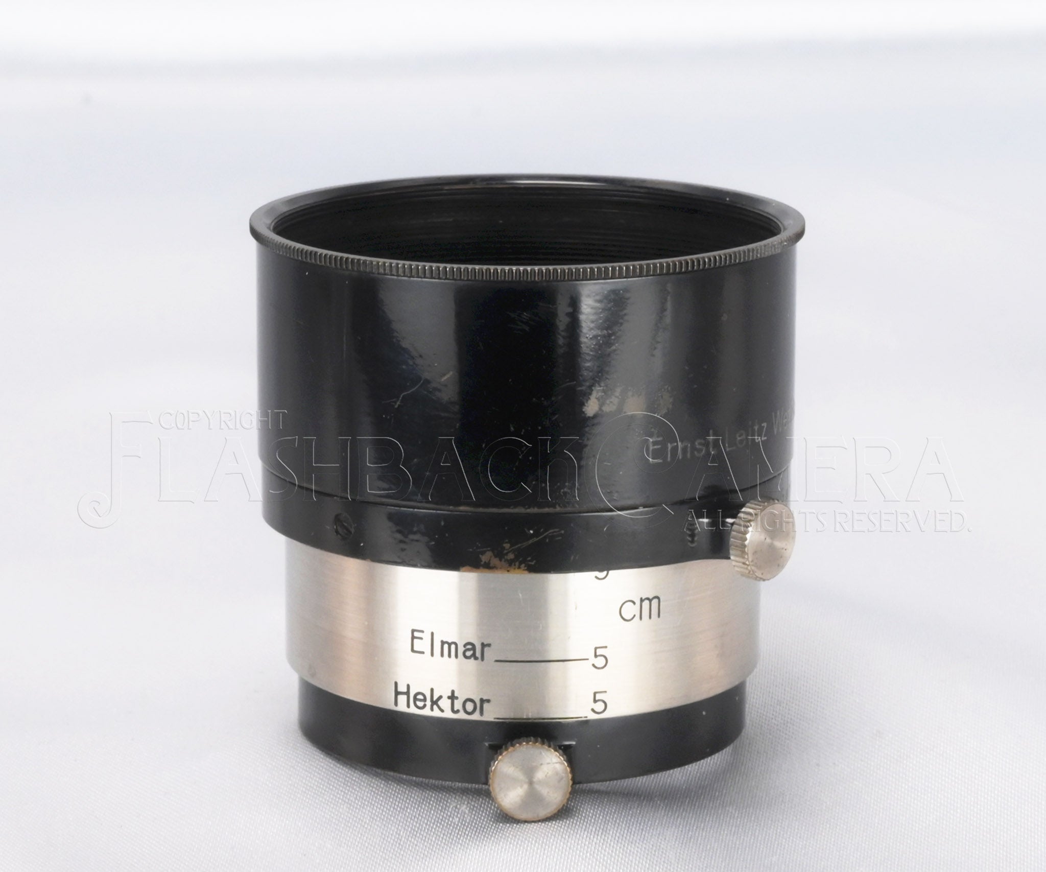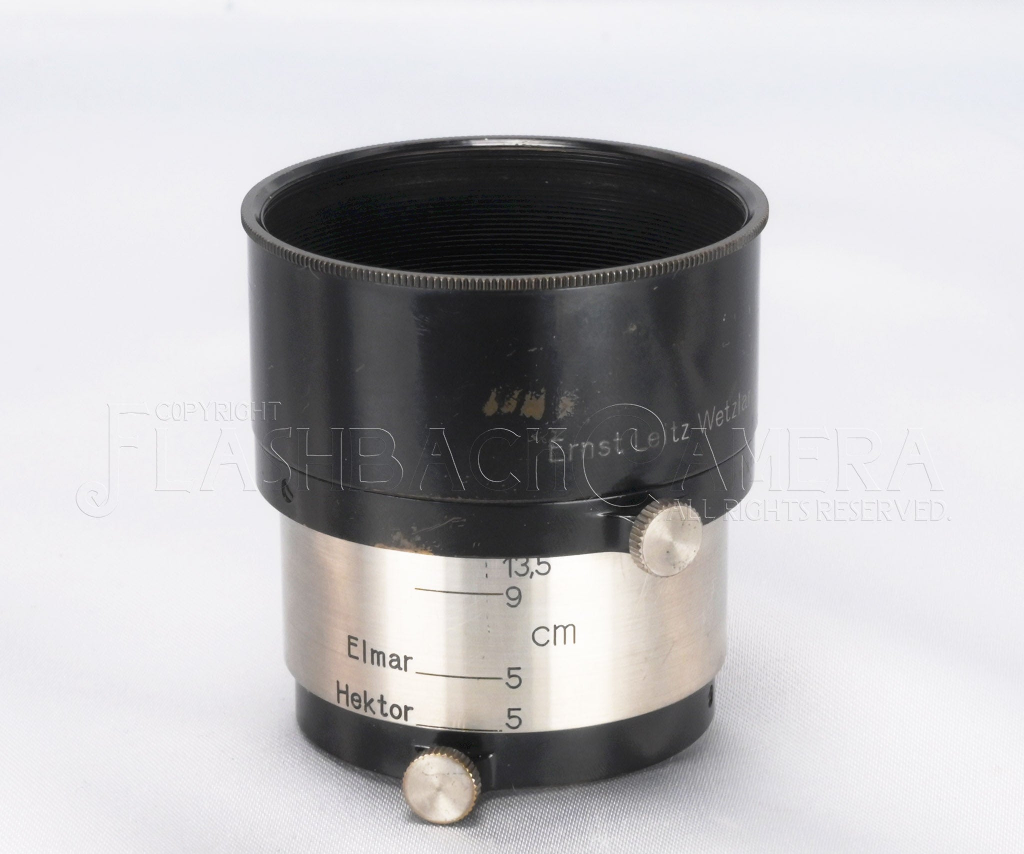 ライツの35/50/90/135mm用ズームフード、FIKUS。36mmかぶせ(A36)。稀少なニッケルバージョン。本品は13.5cm、9cm、Elmar 5cm、Hektor 5cmの4つの表記がされています。フード部には「Ernst Leizt Wetzlar」の銀象嵌。