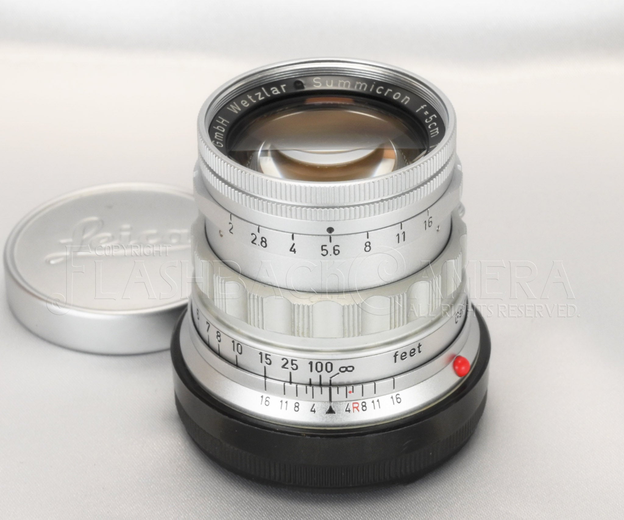 ズミクロン 50mm f2、第1世代。本品は固定鏡胴の前期型。製造番号147万台、1957年製。ライツの製品コードはSOSIC-MS、後に11818。距離表記はfeet。最短撮影距離は1m。