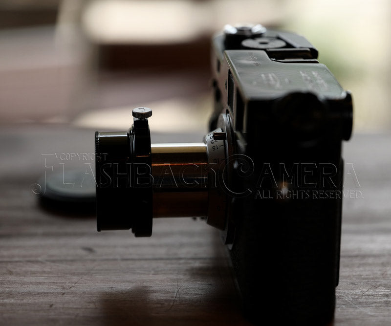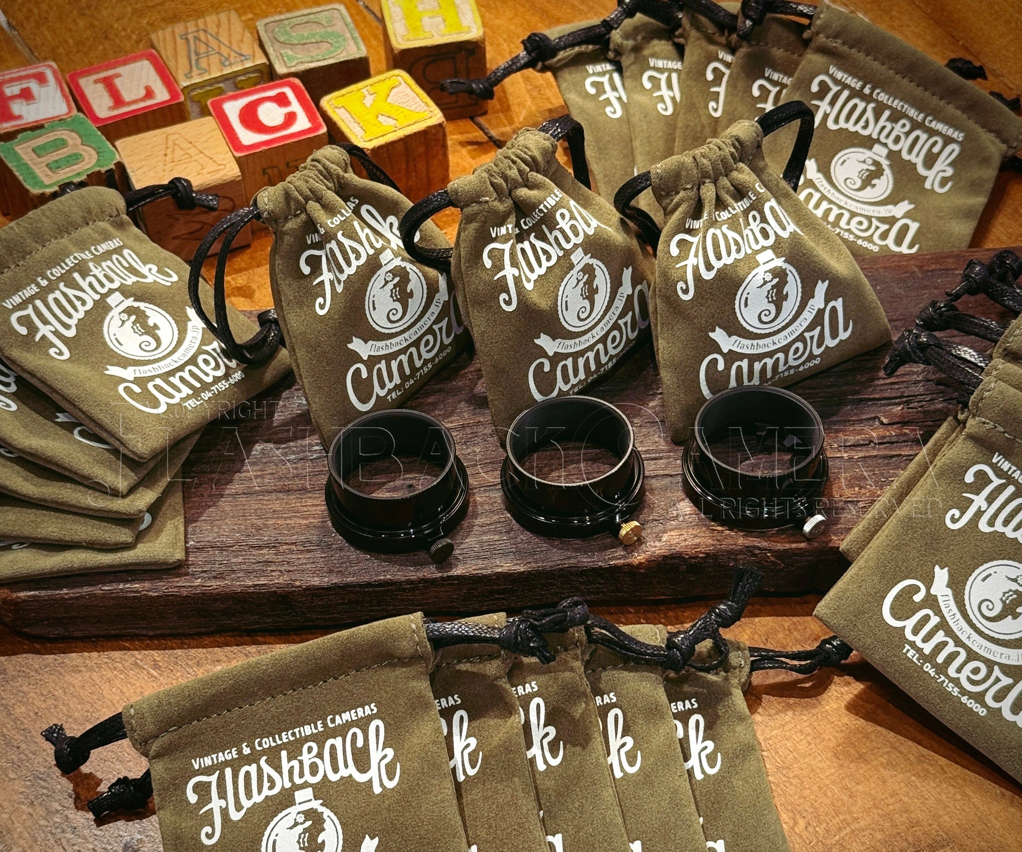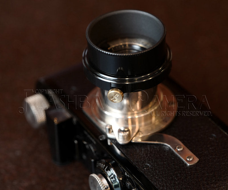 エルマーは製造年代により、外径、絞りツマミの高さや幅、回転角などが異なり、全てのモデルに合うよう1年以上にわたり試作を繰り返しました。妥協無き仕上がりです。交換可能な留めネジにはFLASHBACKの「F」を刻印しました。