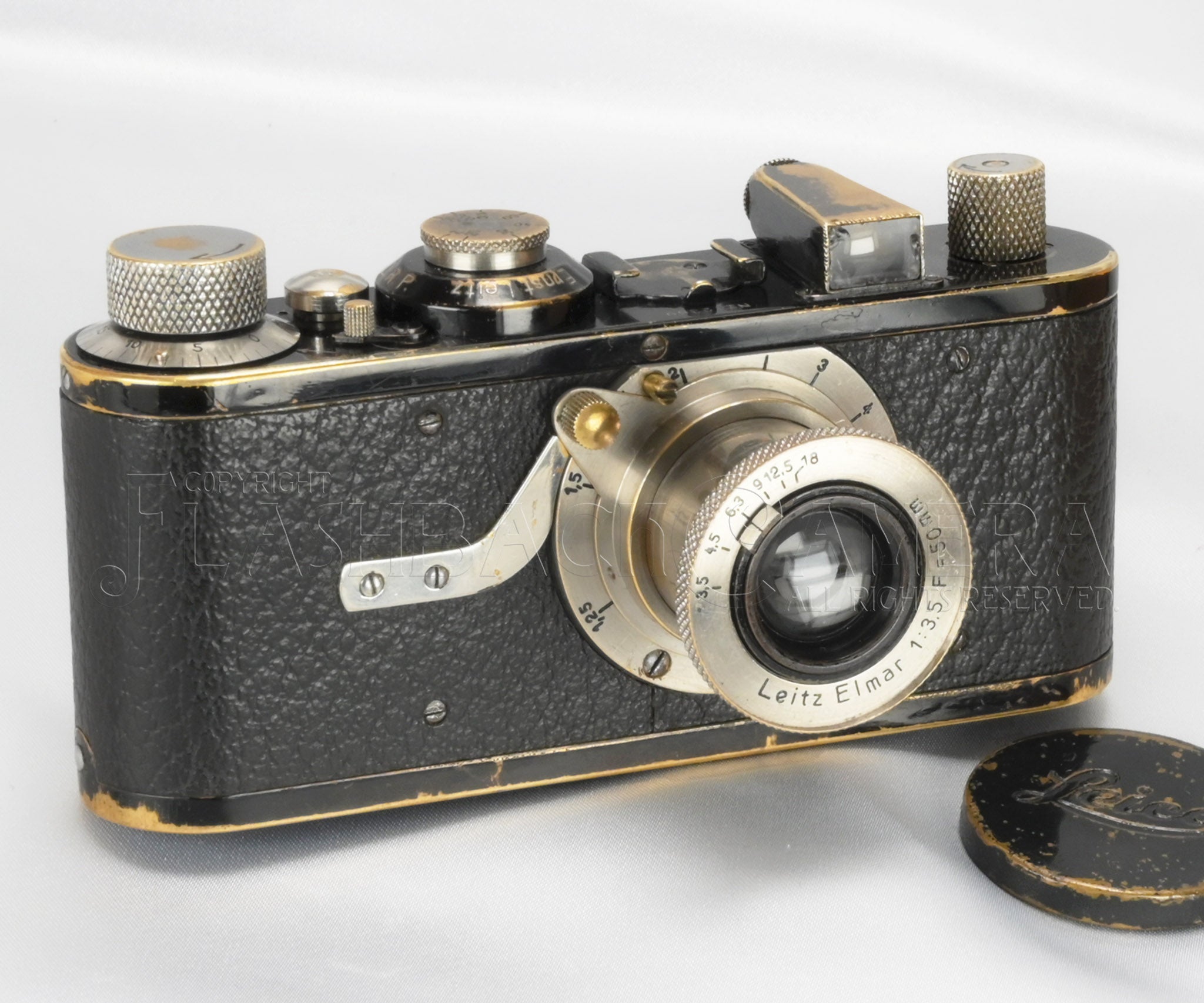 シャッターレリーズはエクボタイプ。本品はえくぼレリーズ付のA型としては終わりの方の個体でしょう。グッタペルカはLeitz Anastigmat 、Elmax時代から続く、目の粗いタイプ。なお、巻上げと巻き戻しノブは、少し後の背の高いタイプへとアップグレードされています。