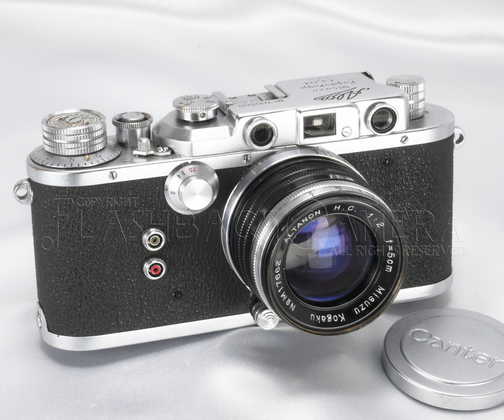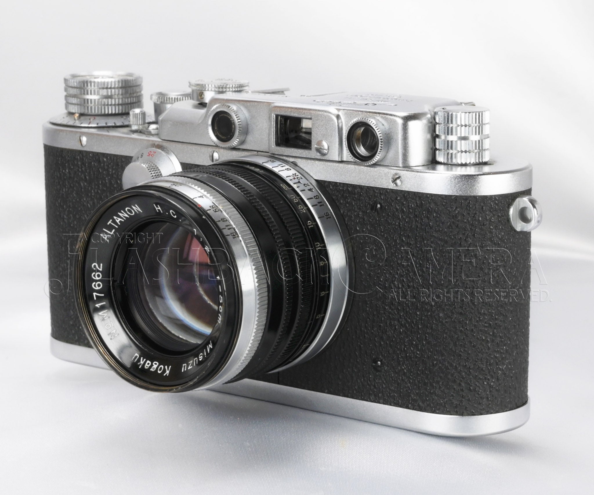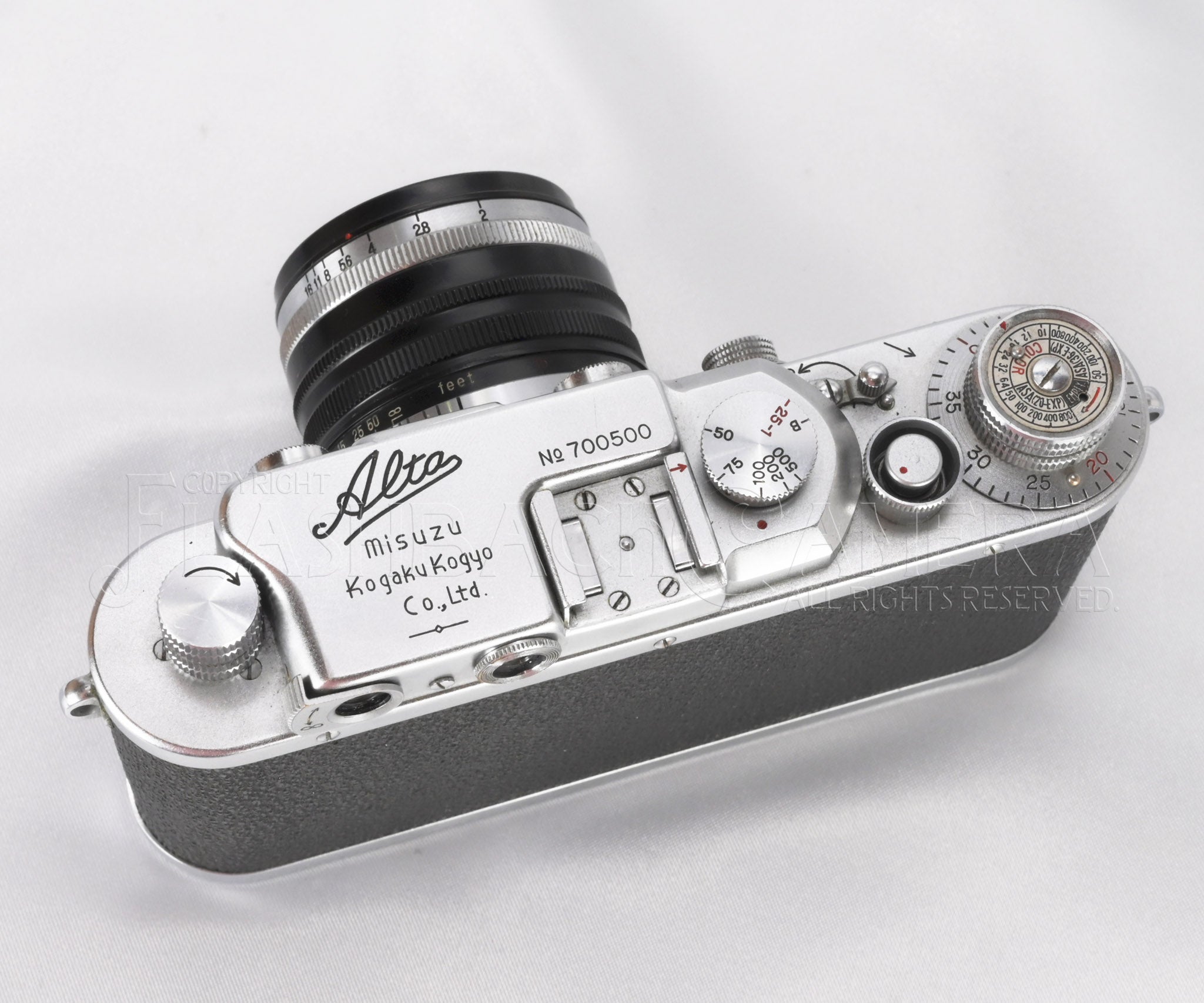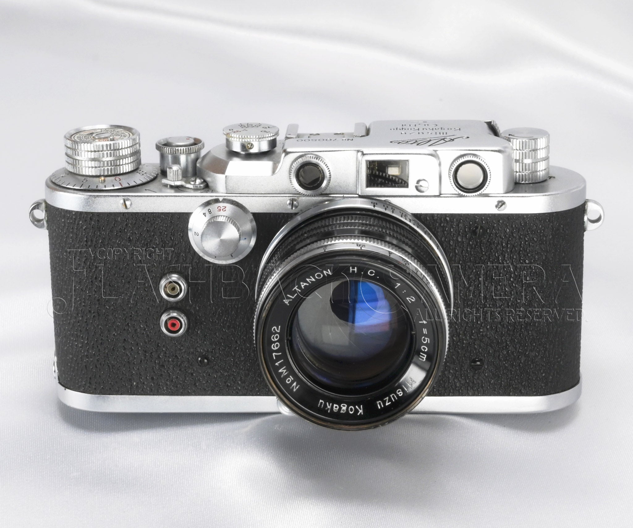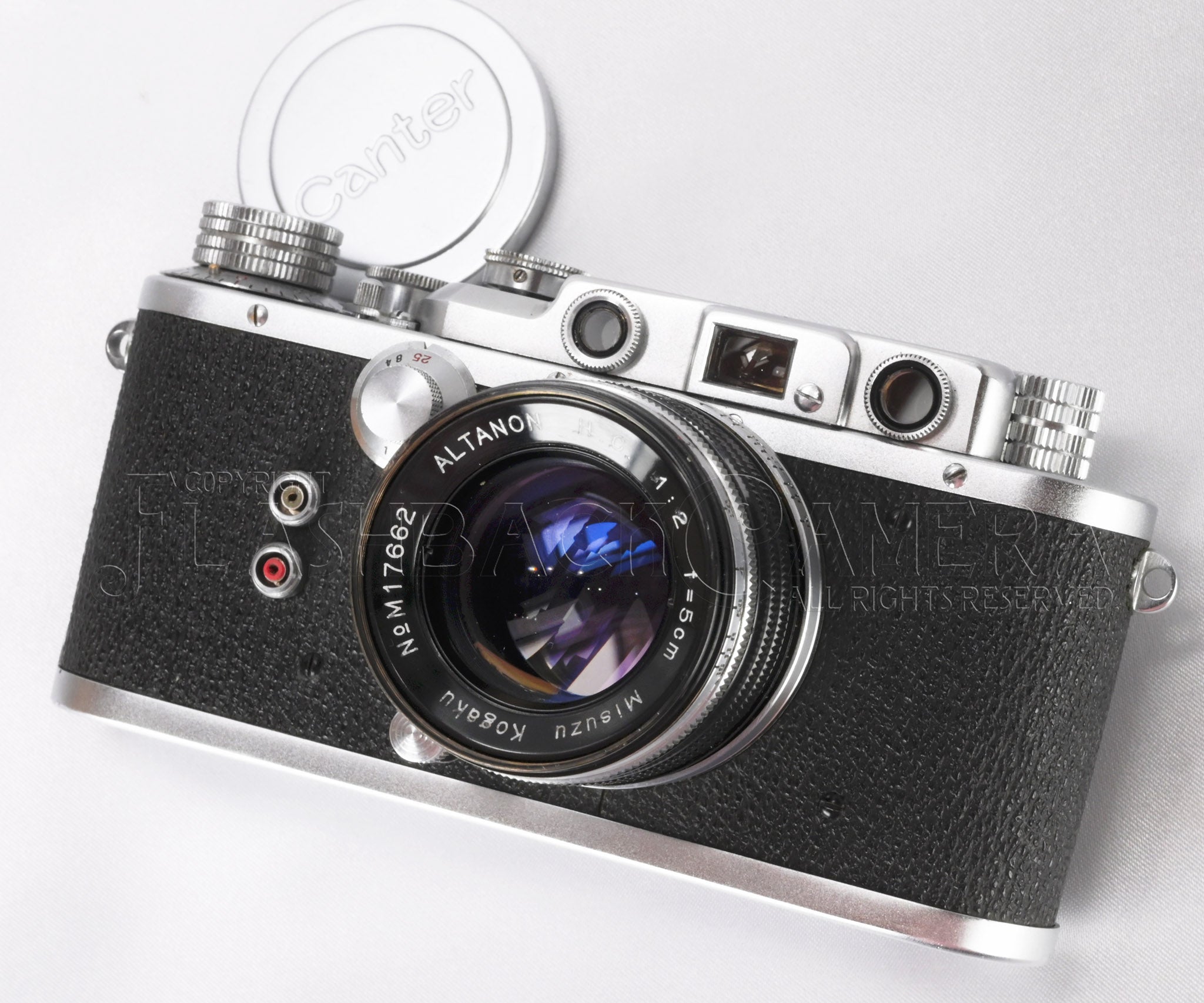 アルタ35。三鈴光学製。製造時期は1957年〜1958年頃。国産では最も遅い時期に登場したライカコピー機。アルタ35の製造台数はわずか500台程度と言われていますが、本品の製造番号はなんと700500のキリ番!これまでこれ以降のシリアル番号も見ていますが、ほぼほぼラストに近い番号を持つ一台です。