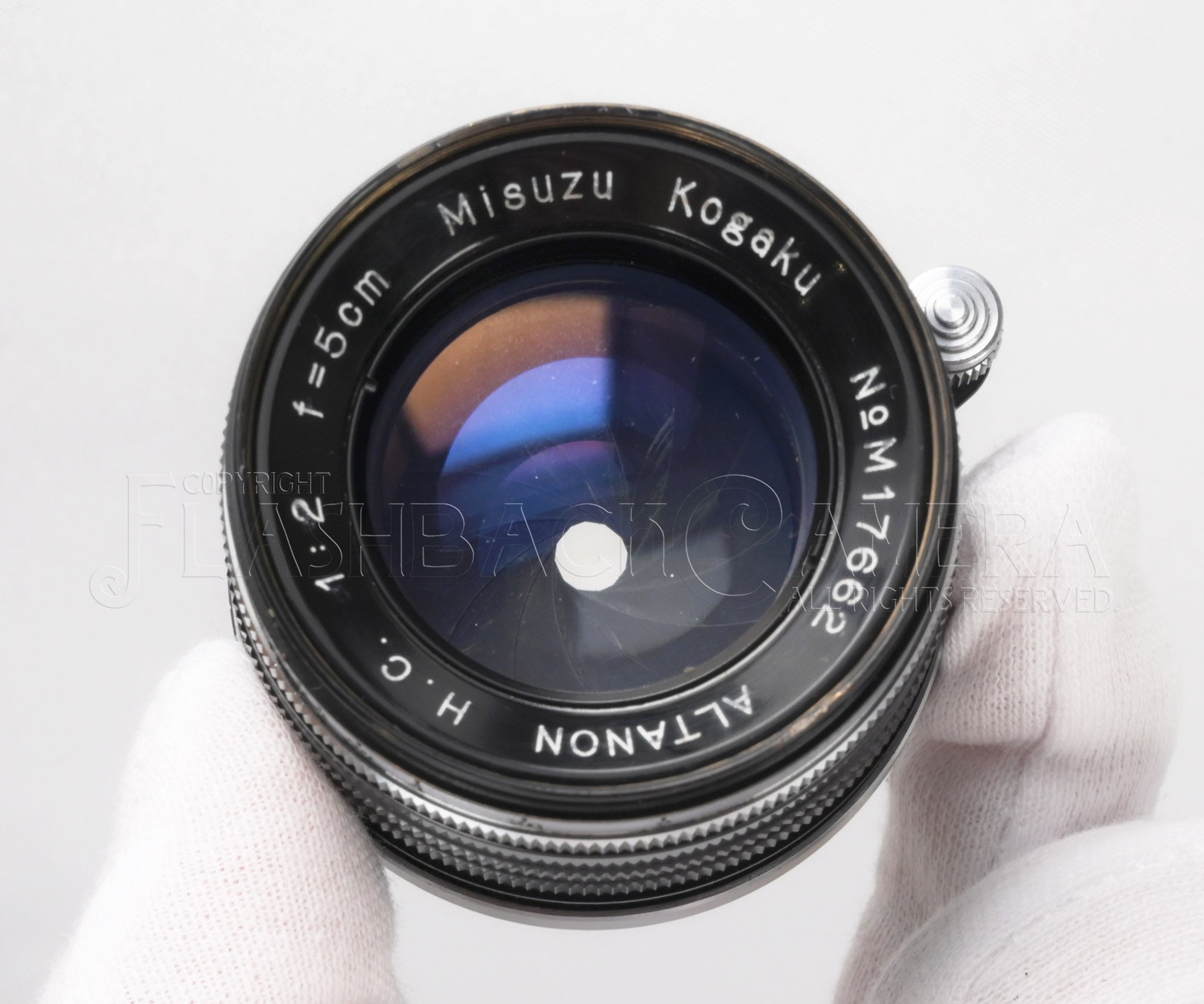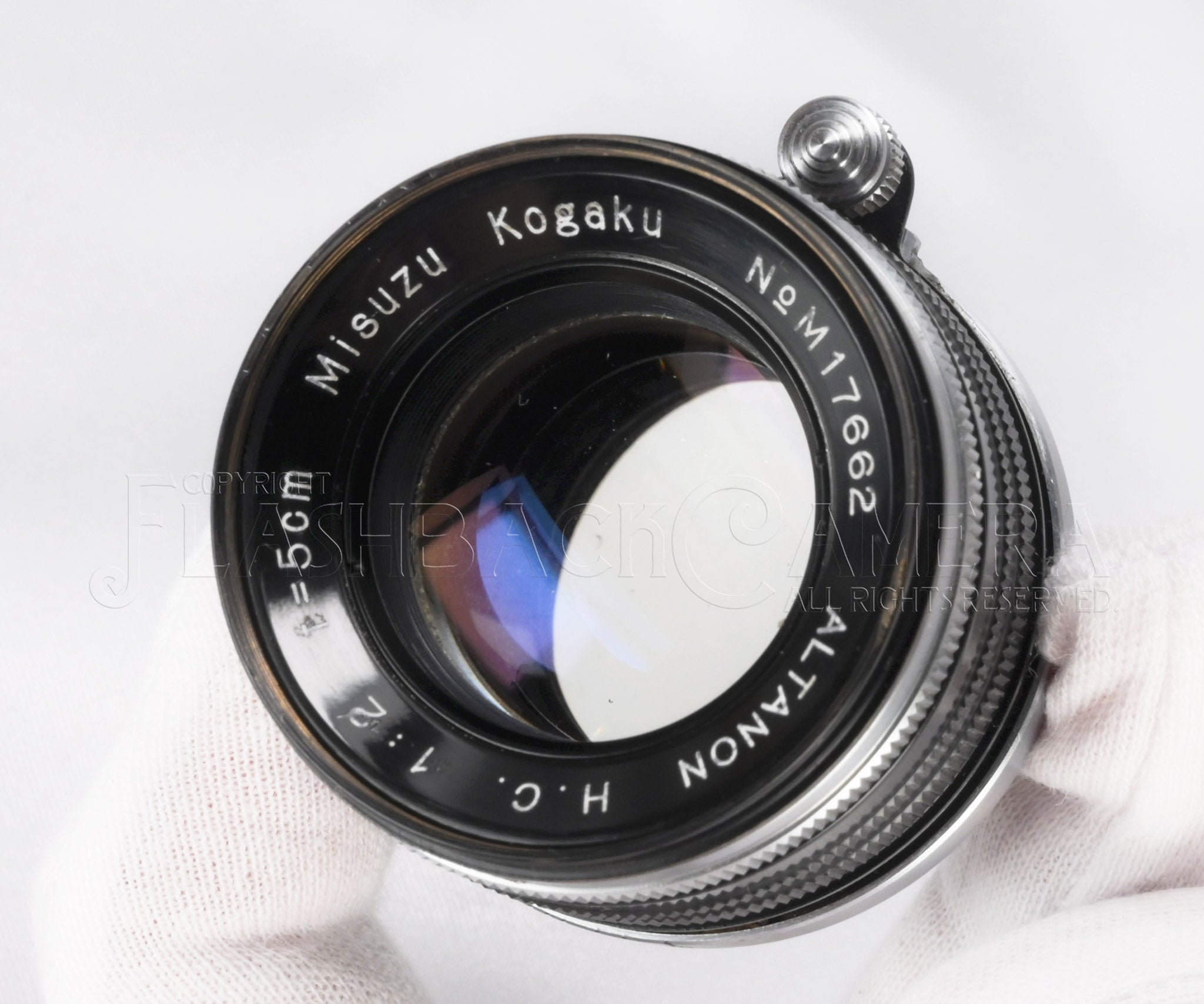 付属のレンズはアルタノン 50mm f2の後期型、黒鏡胴。ライカLマウント。3.5feet(約1m)まで距離計連動し、そこからは距離計非連動ながら1.5feet(約45cm)まで近接撮影が可能です。ニッコールレンズにも似た接写機能ですね。