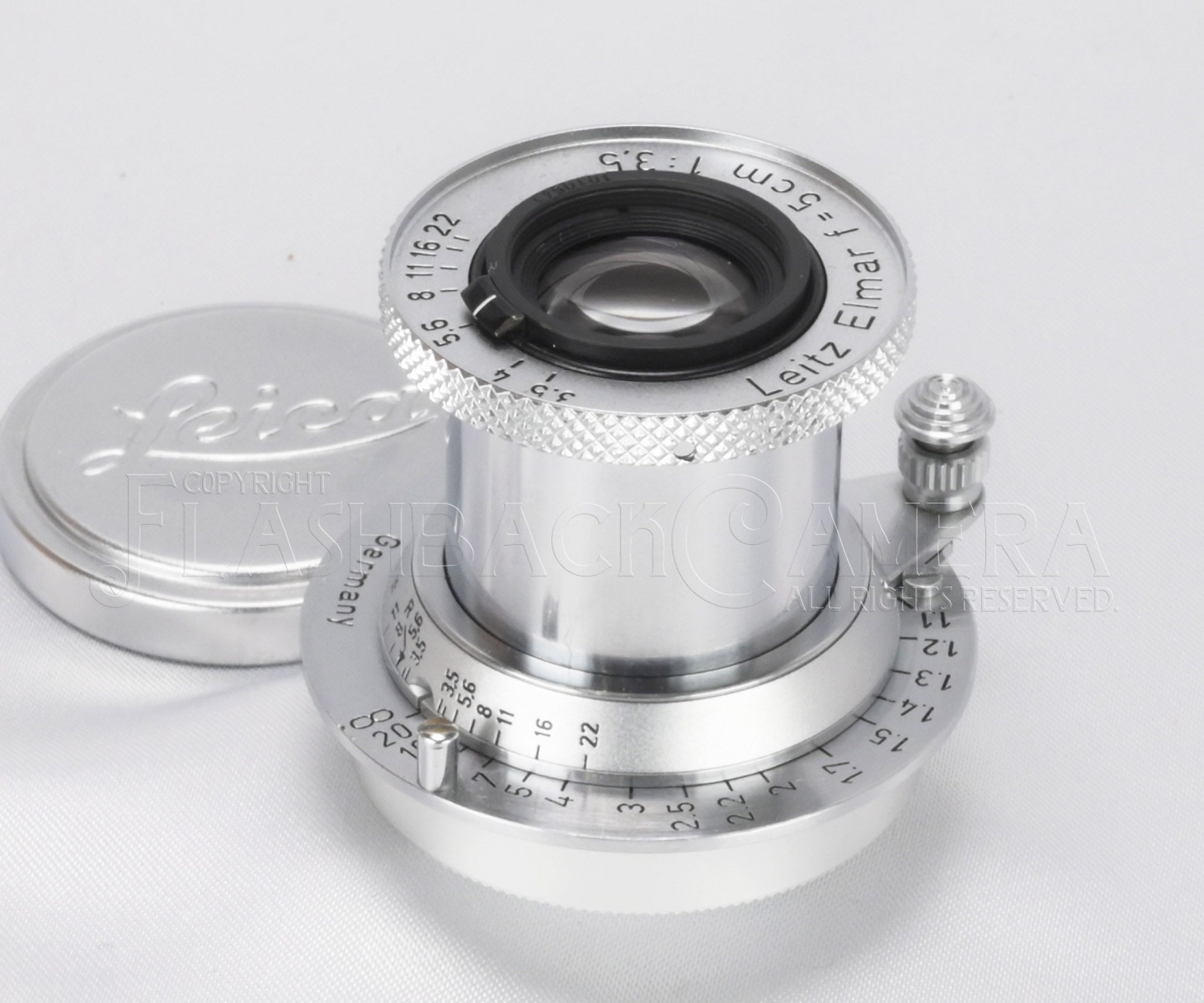 1926年頃から供給されはじめたライカのザ・スタンダードレンズ、エルマー 5cm。適合純正フードはFISONですが、絞り操作ができる当店オリジナルのエルマー用フード、FB-07も装着可能です。