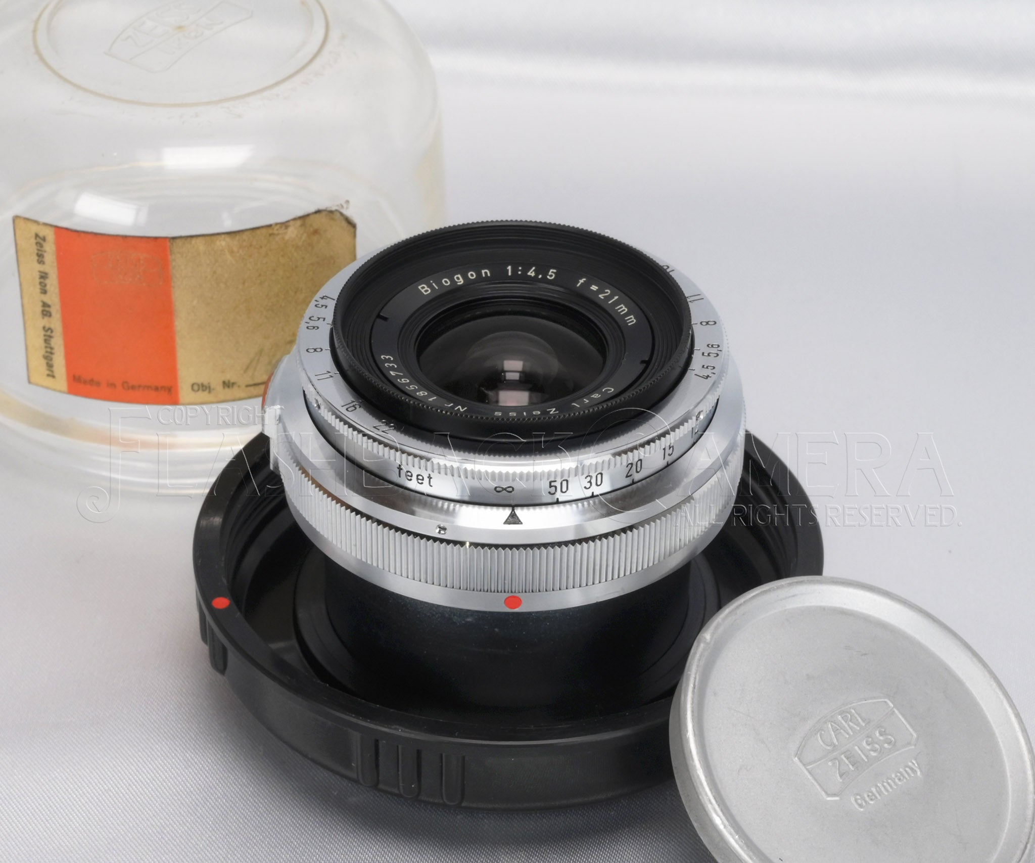 番号一致のプラケース、Carl Zeiss銘のアルミ純正キャップが付属します。レンズキャップとプラケースの間に挟まるボール紙まで付属。コレクションにも。得難いコンディション!