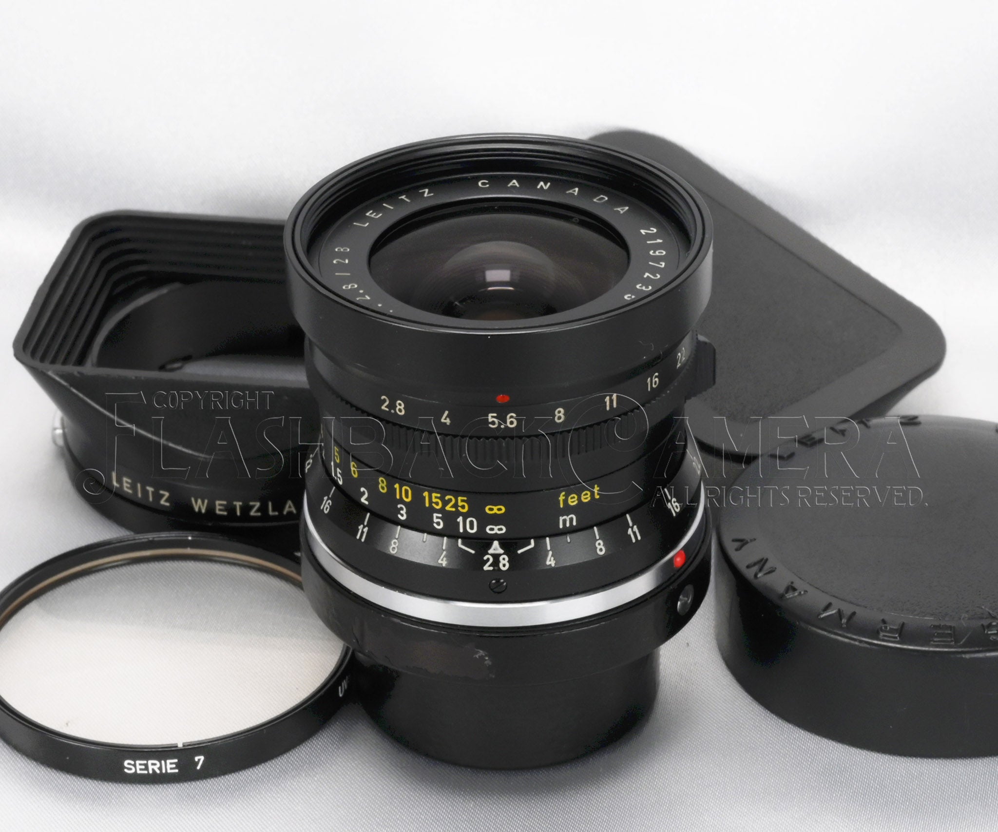 エルマリート 28mm f2.8 1st 後期、イエロースケール。通称9枚玉。219万台、1966年製。非レトロフォーカス設計。スーパー・アンギュロンを元にした対称型レンズです。ライカM5やCLでは露出計アームが干渉するため、お使い頂けませんのでご注意ください。28mmのブライトフレームが存在しなかった時代のレンズのため、35/135mm枠が表示されます。