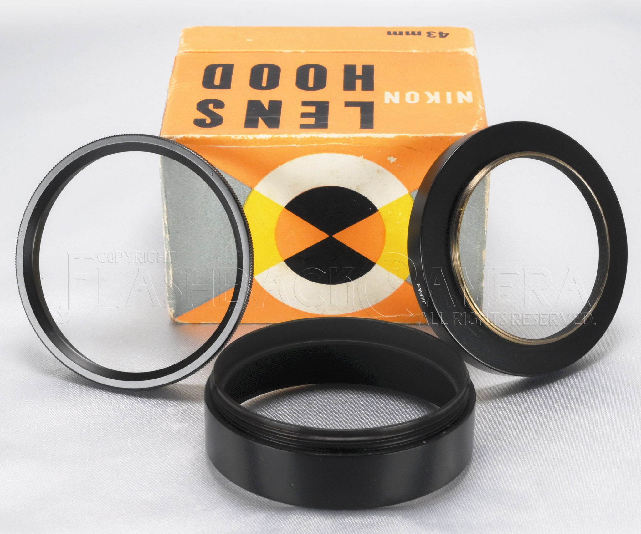 ライカ・スクリューマウント、ニコン Sマウント兼用のニッコール 50mm f1.4用レンズフード。43mm径、2分割ねじこみ式。AN-43mm。初期のフードはアルミ製でしたが、本品は最終バージョンで真鍮に黒塗装。