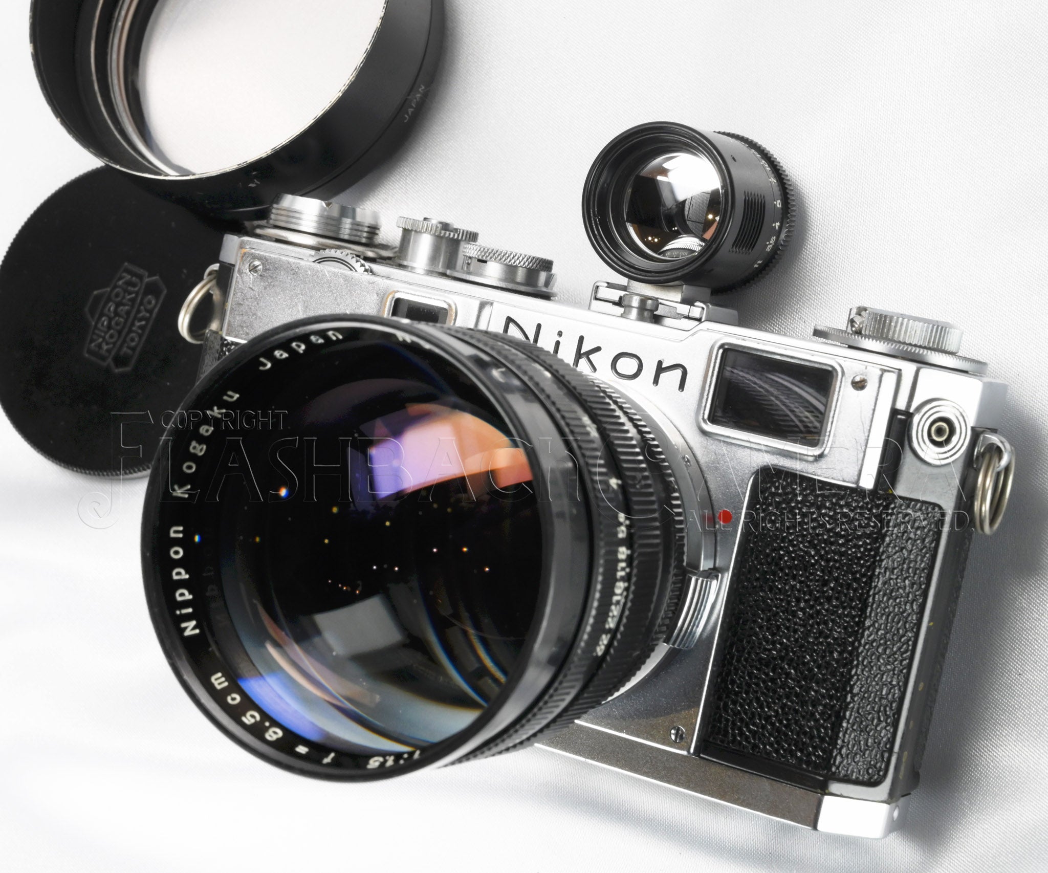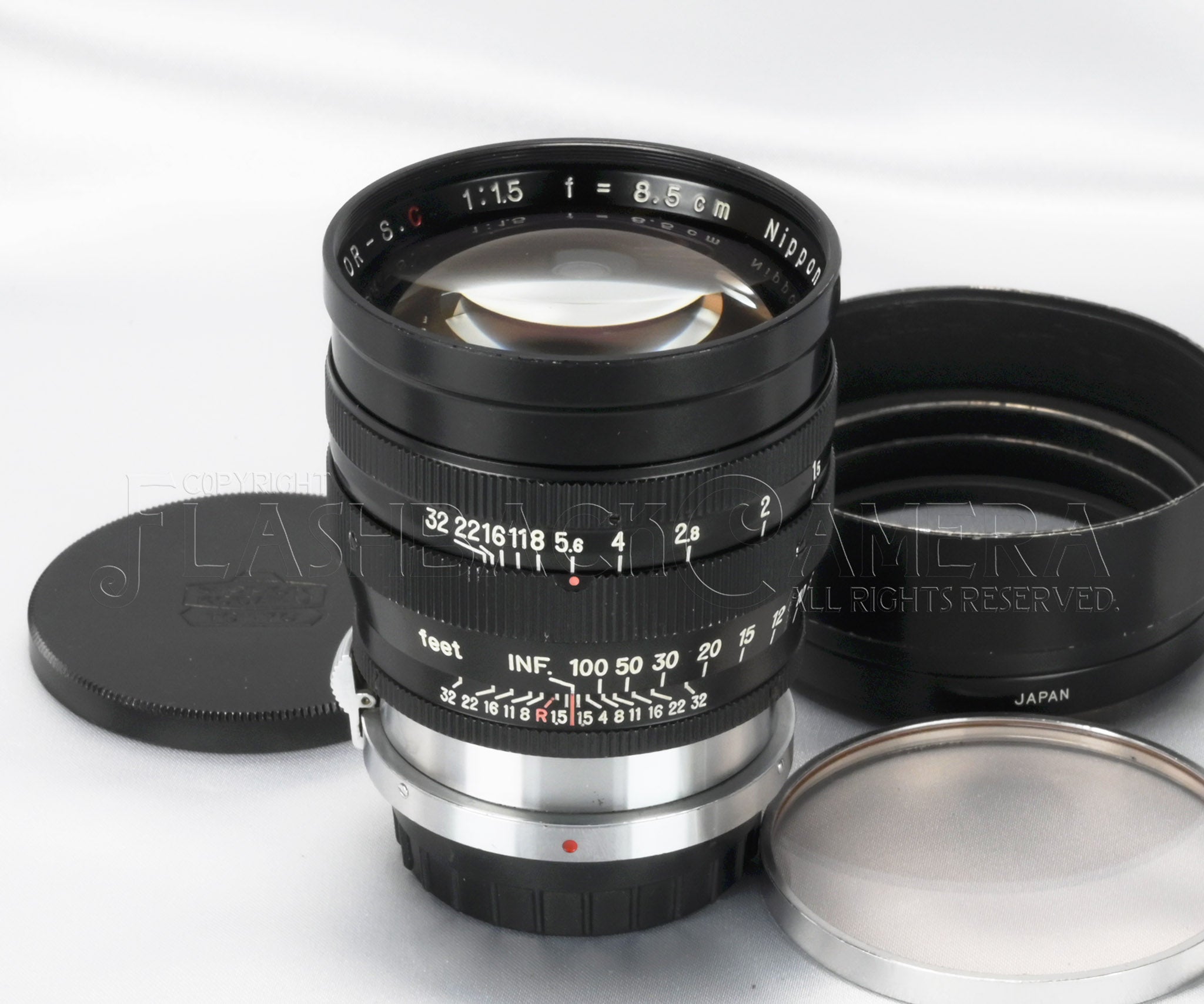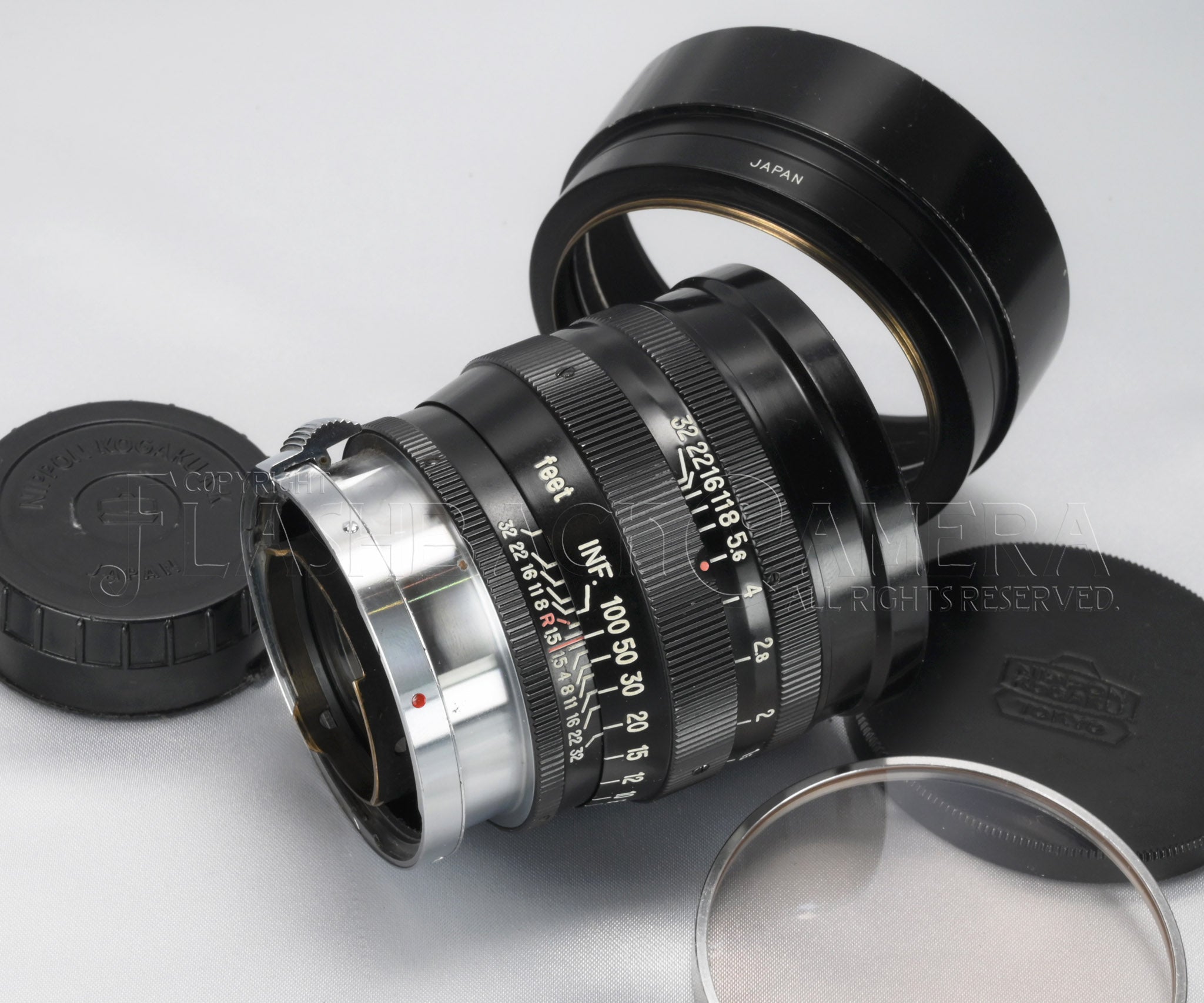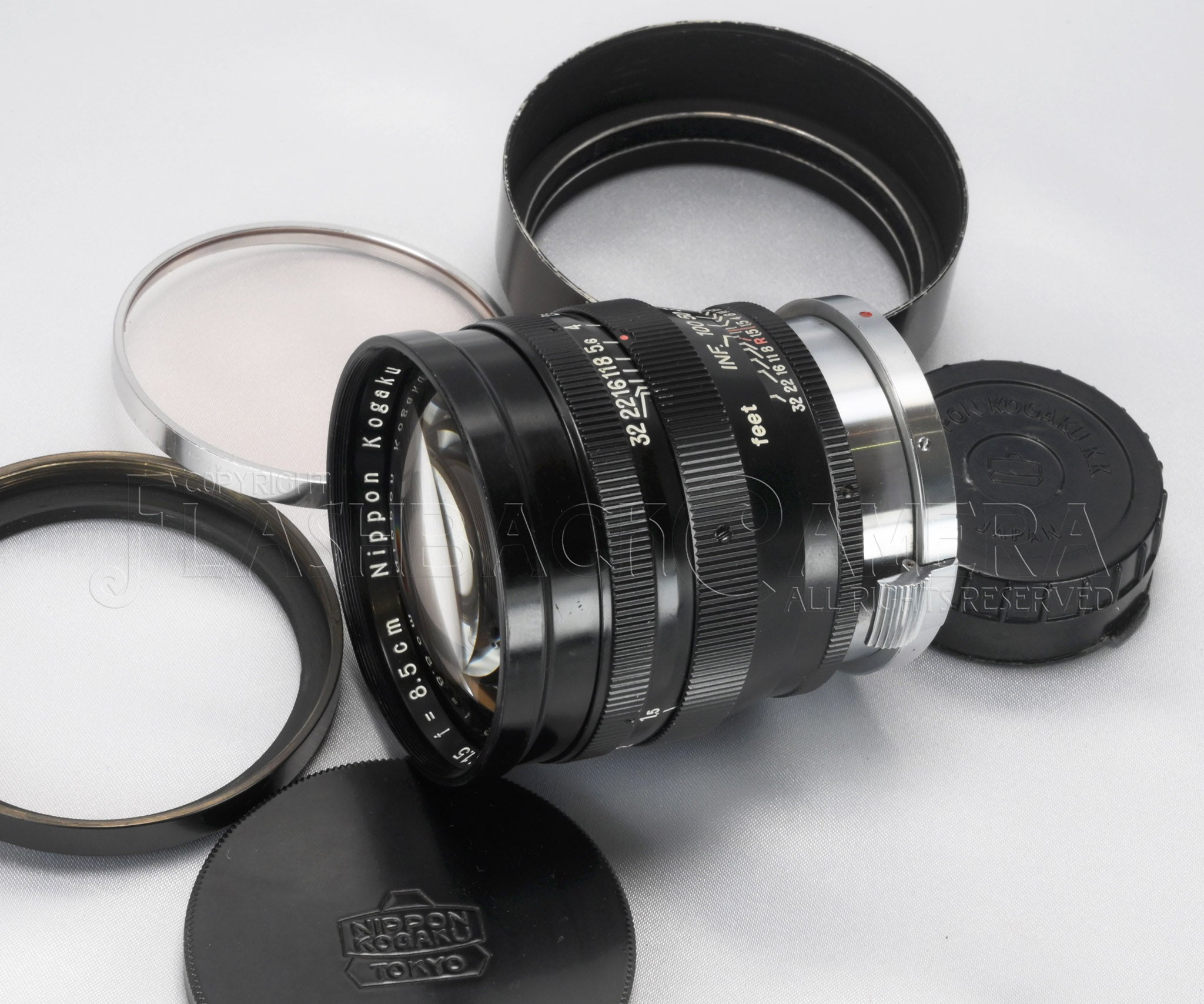 ニッコール-S・C 8.5cm f1.5。ニコンSマウント。日本光学製の大口径中望遠レンズ。ブラックペイントとクロームメッキ仕上げの堂々たる立派なつくり。3群7枚構成。feet表記。フィルターは60mmねじ込み、または二分割できるフードに、シリーズ8フィルターを挟み込みます。