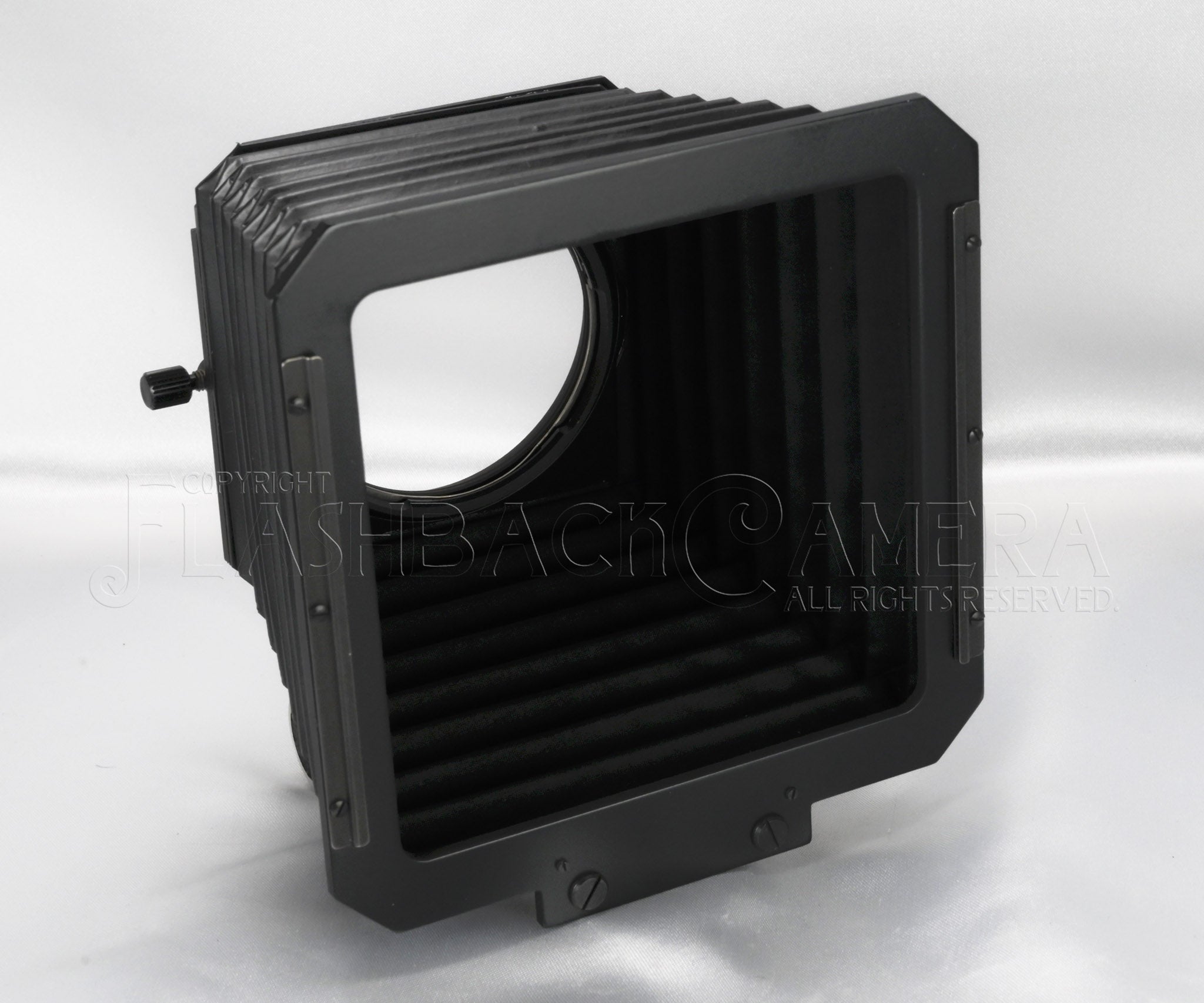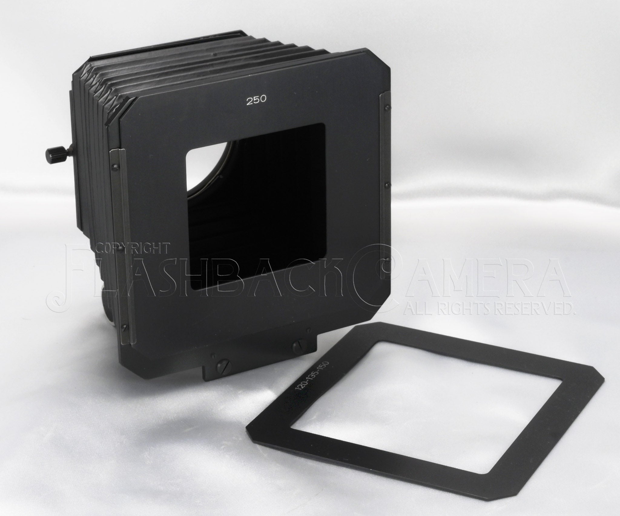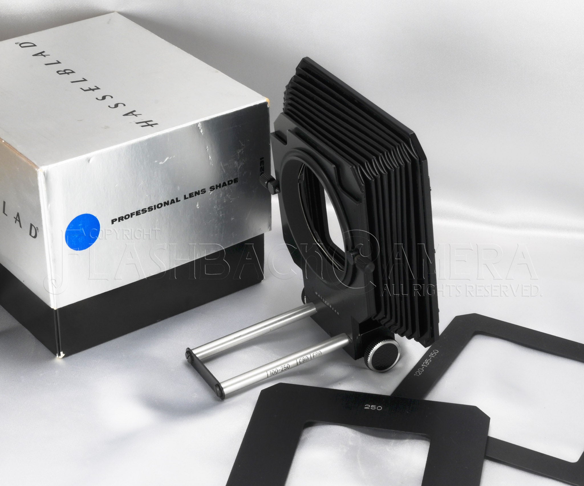 ハッセルブラッド用プロフェッショナル・レンズフードの初代モデル。40231。1969年に登場し、1981年まで製造されました。38mm〜250mmと幅広いレンズに対応します。120/135/150mm用と250mm用の2種類のマスクも付属。