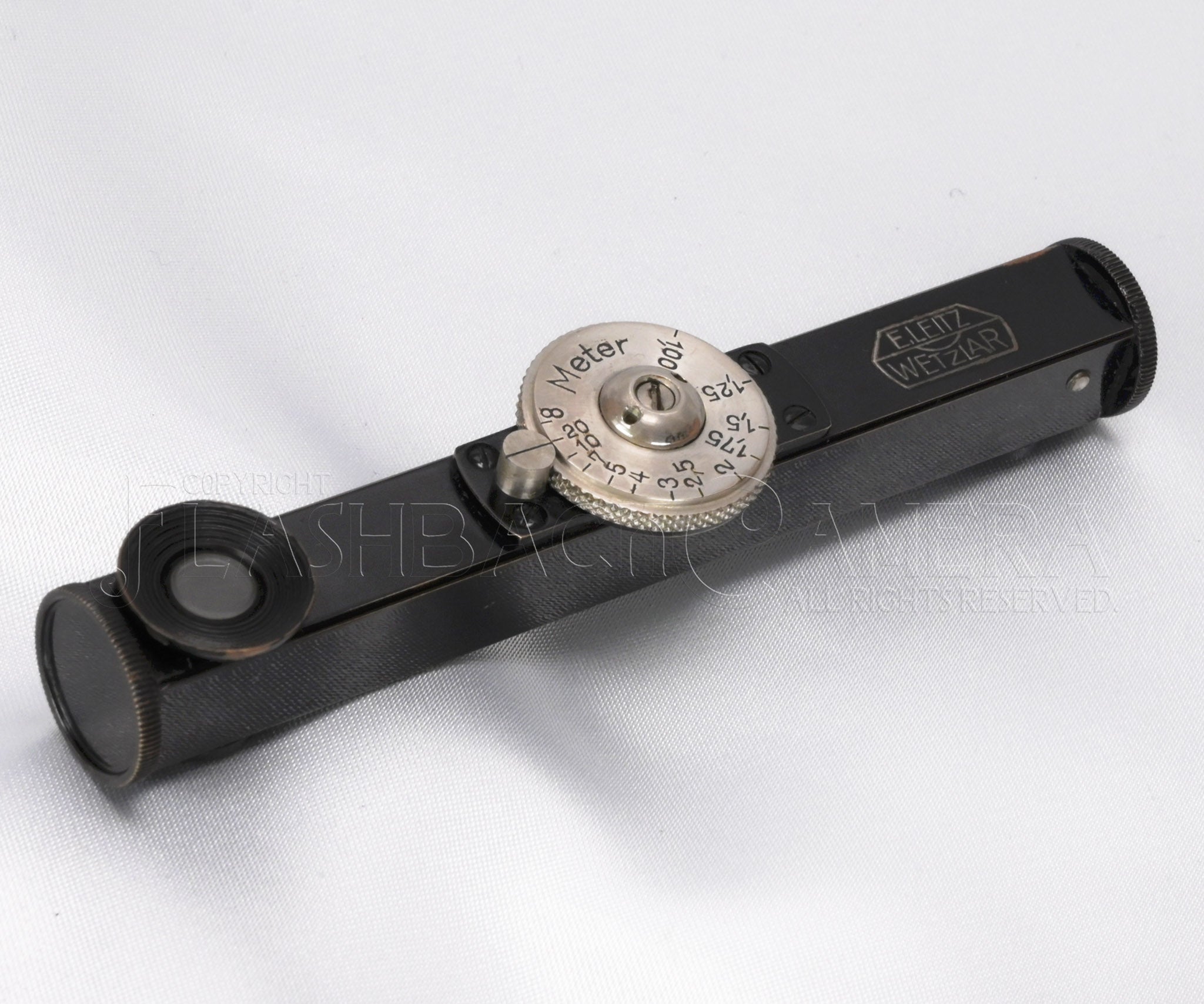 ライツの縦型距離計、FODIS。距離ダイヤルが小径の初期タイプ。5桁のシリアル刻印入り。1920年代の製造です。距離表記はメートル。最基線長83mmでかなり正確に計測できます。最短測距距離は、DII以降の内蔵距離計と同じ1m。