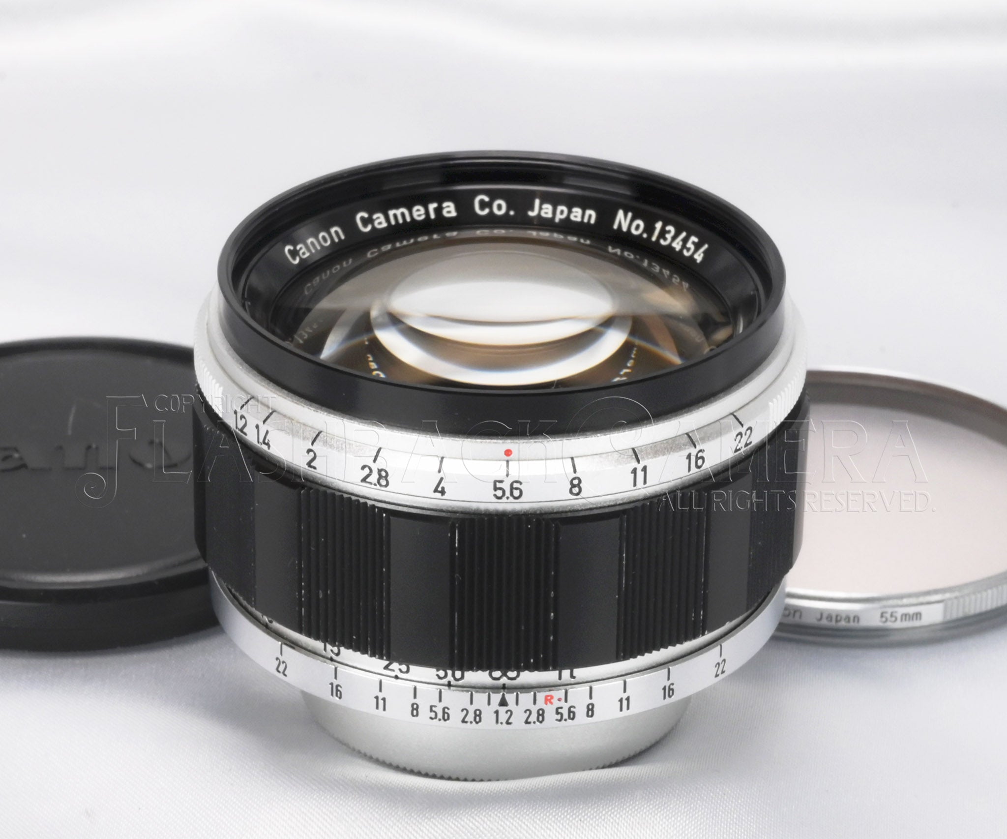 キヤノン 50mm f1.2、ライカ・スクリューマウント。1956年登場。レンズ構成は5群7枚。feet表記。フィルター径は55mm。本品のシリアル番号は13xxxで、1957年頃の製造と思われます。