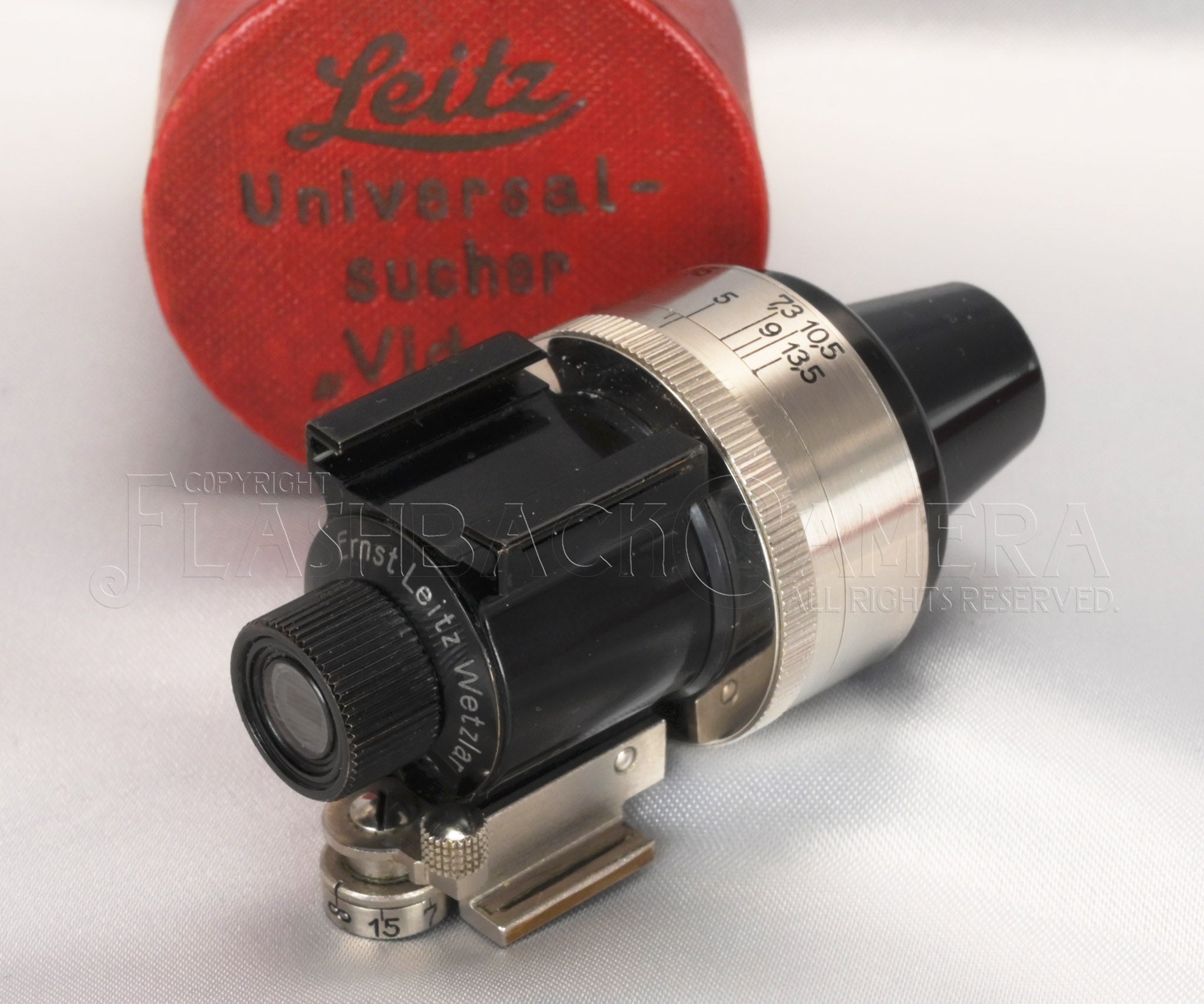 ライツの逆像ビドムファイダー。黒/ニッケルの仕上げが美しいアクセサリー。本品はシュー部分が短いタイプ。35/50/73/90/105/135mmレンズに対応します。パラックス補正はフィート表記。シューの裏側にはGermany刻印が見られます。