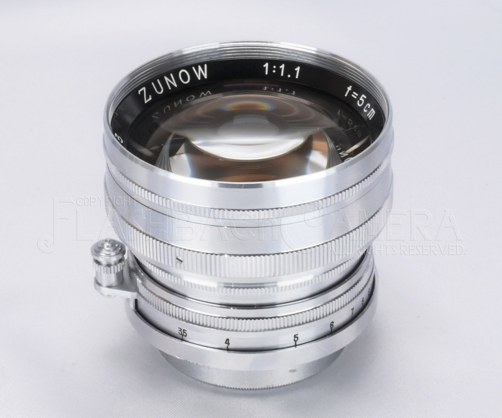 ズノー 5cm f1.1 中期型。ライカ・スクリューマウント。距離計連動。製造番号6000番台。Zunow Opt.銘。1955年に帝国光学からズノー光学工業へと社名変更され、銘板の刻印文字も変わりました。へリコイドの距離表記はfeet。