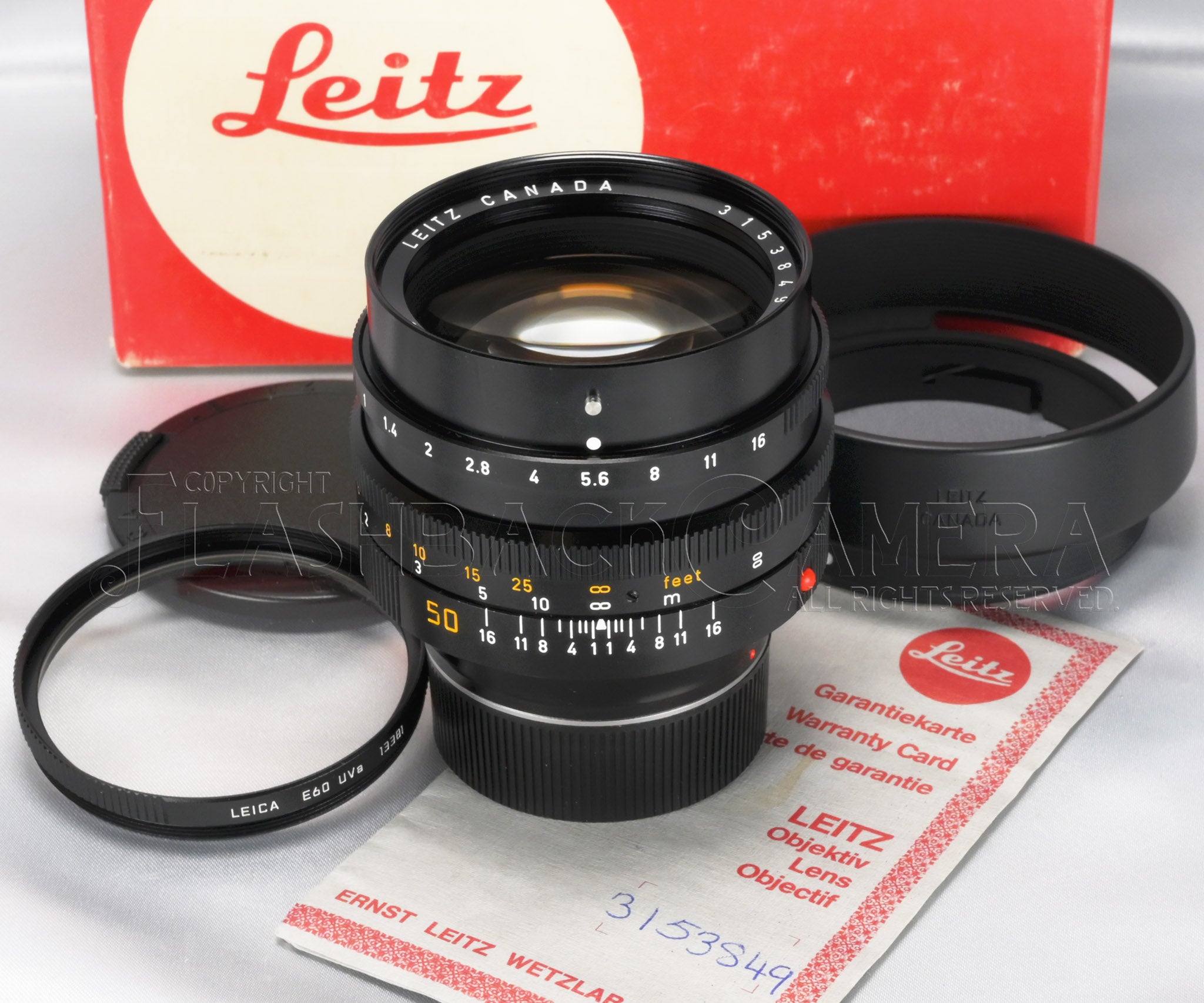 元箱、当時の保証書、12539フード、13381 E60 0UVaフィルター、前後キャップが付属します。
