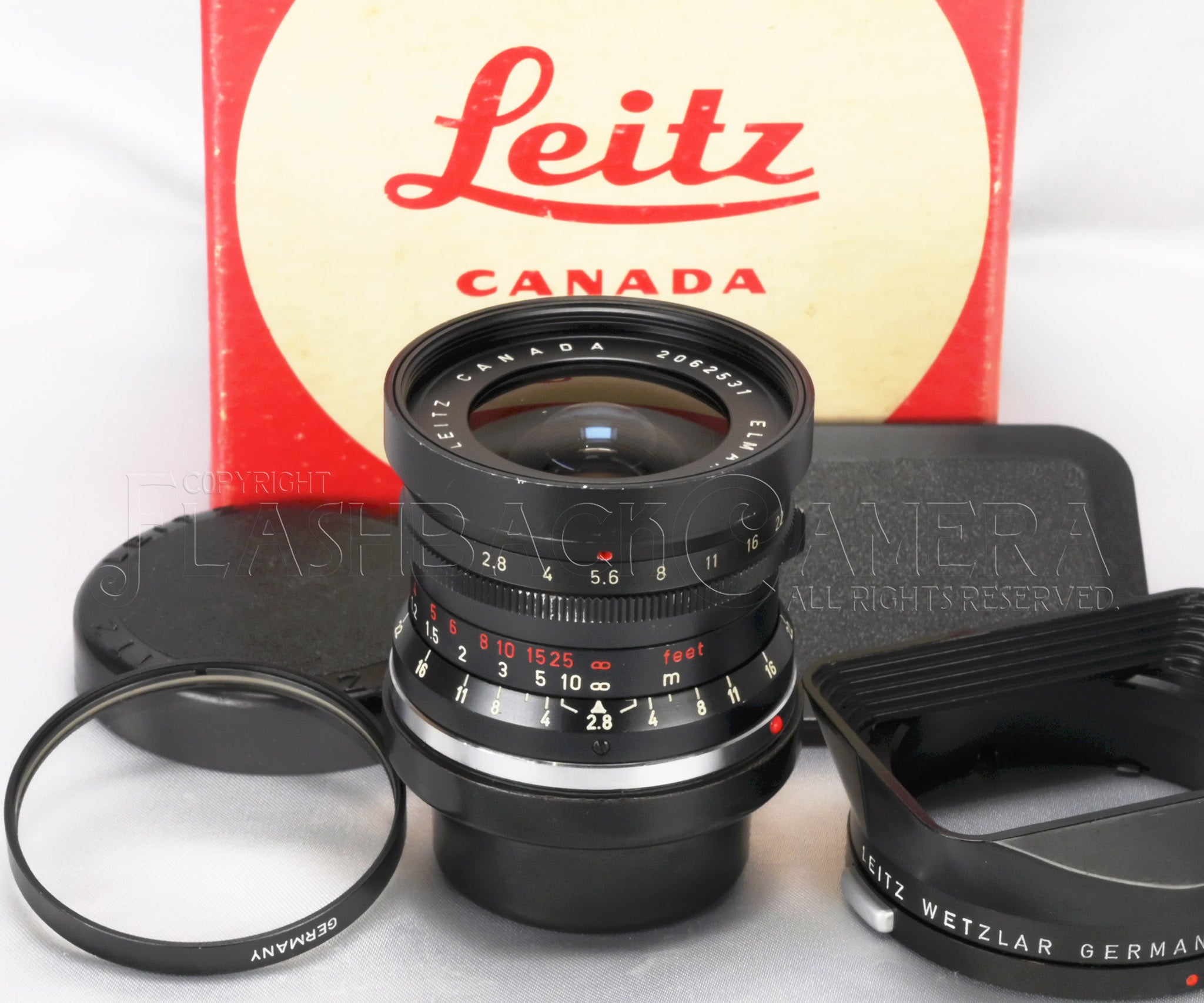 エルマリート 28mm f2.8の初期型、通称9枚玉。人気のレッドスケール。カナダ製。ライツの製品コードは11801。製造番号206万台。1964年製。6群9枚構成の非レトロフォーカス。