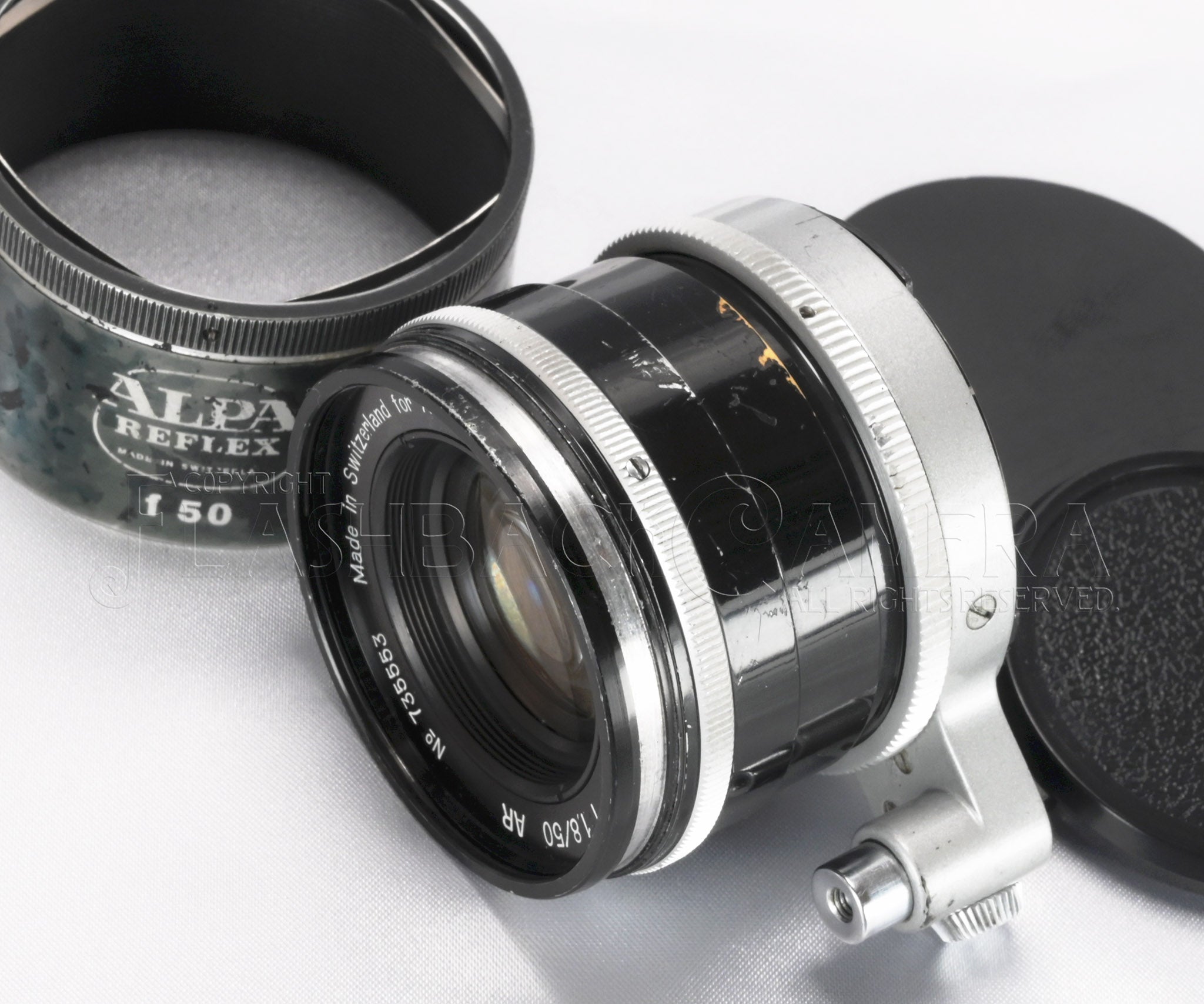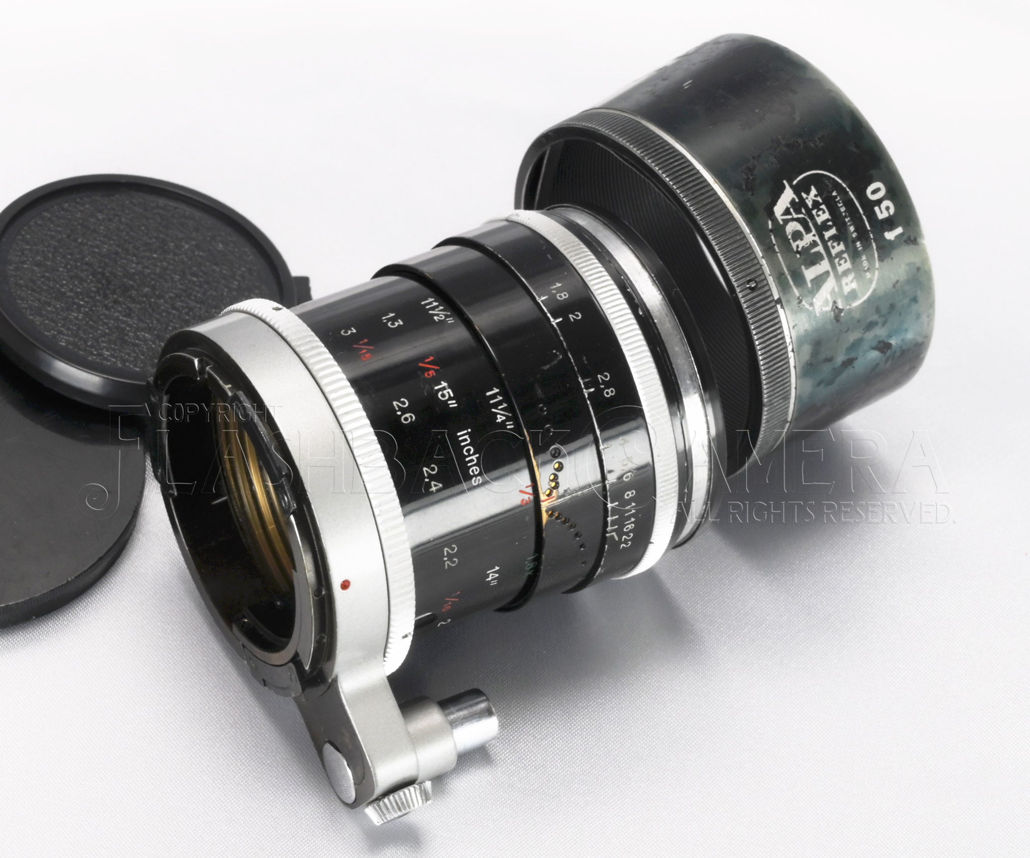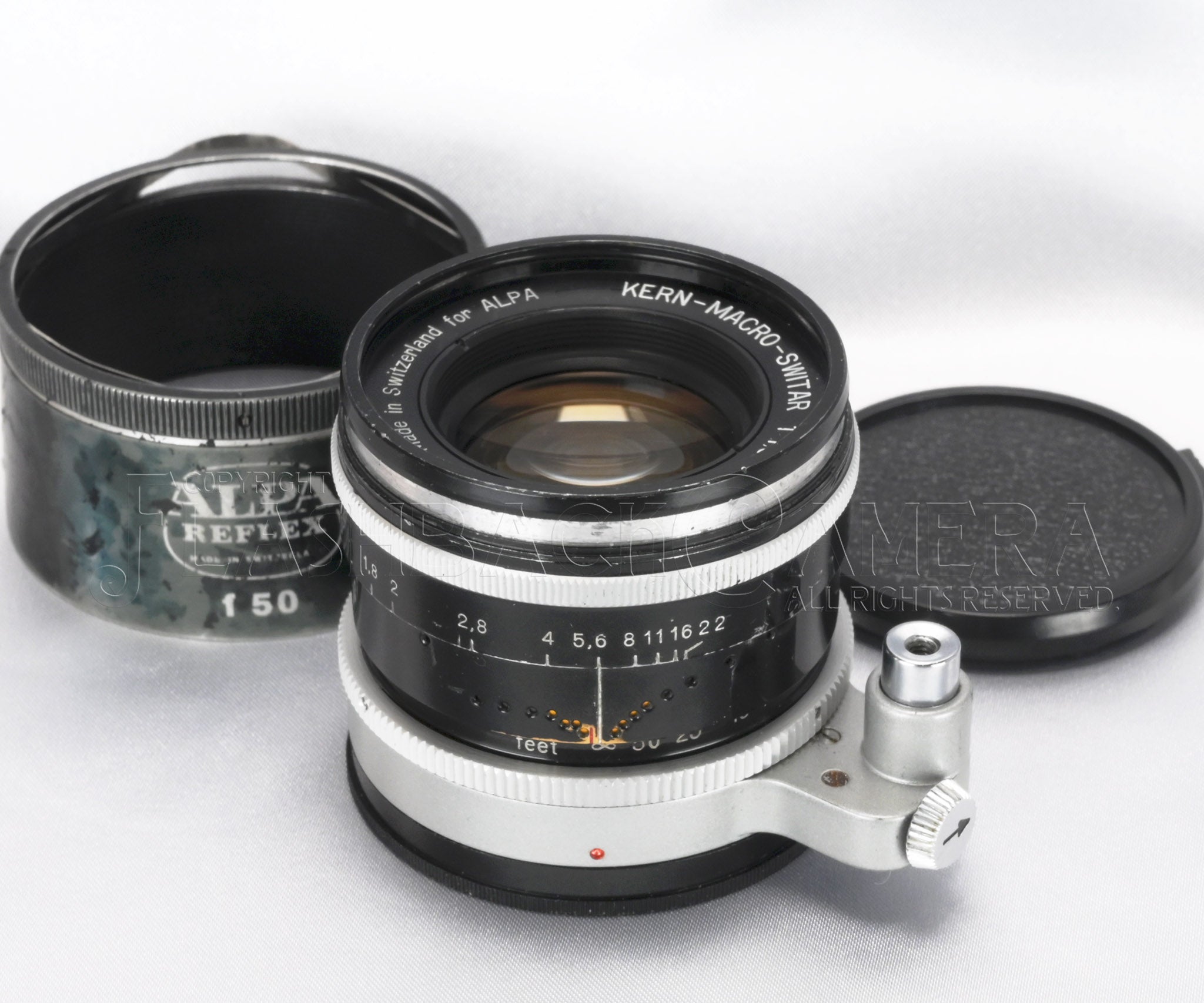 スイス・ケルン社製マクロスイター 50mm f1.8。1958年に登場、1969年までアルパ用標準レンズとして活躍しました。シネレンズ専業メーカーのケルン社が製造した、数少ない写真用レンズ。5群7枚のアポクロマート・レンズ。距離表記はfeet。